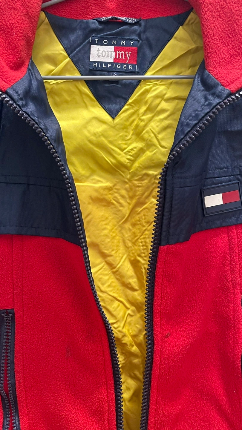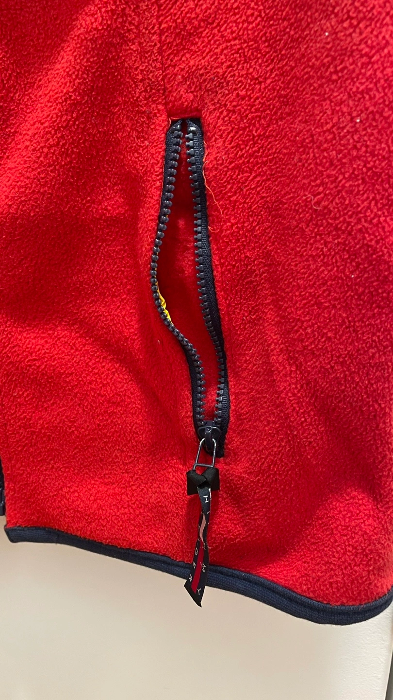 Red and navy blue fleece vest. Bright yellow interior. Full zip closure. Two zippered pockets. Made in Hong Kong.