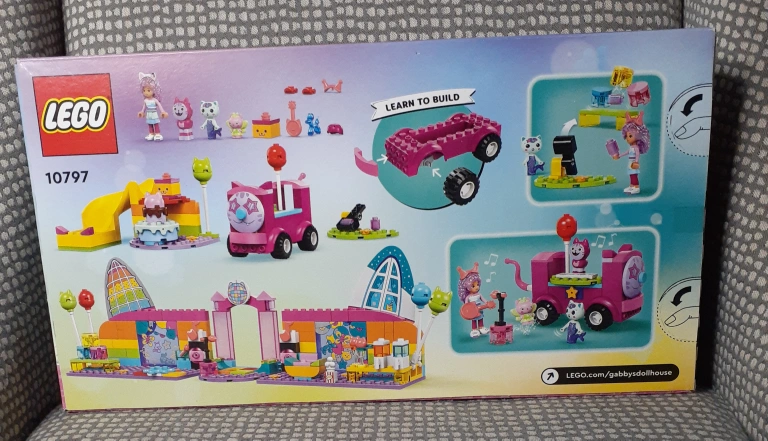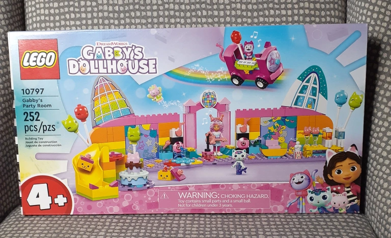 LEGO set. 252 pieces. Ages 4+. Building instructions included. Features Gabby and her cat friends. Includes a party room and a fun vehicle.