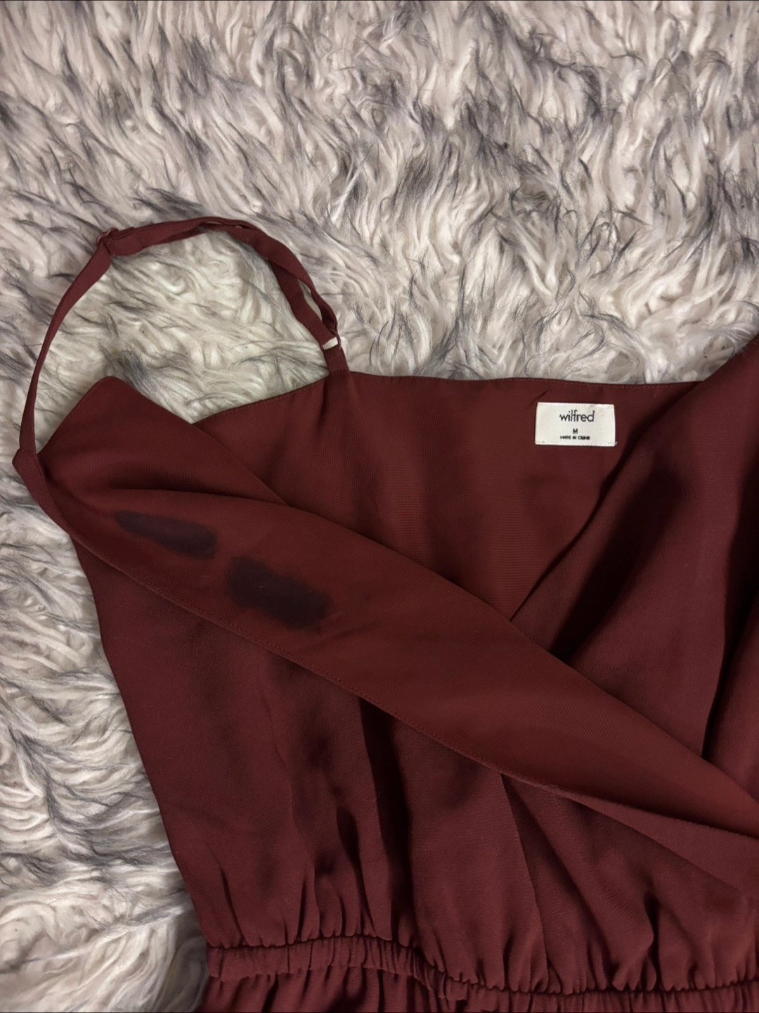 Only worn twice. Great conditions. I wore tapes for this on the inside, and I forgot to remove them, so it got the fabric stained but it’s not visible when worn. Apart from that, no rips or other stains.