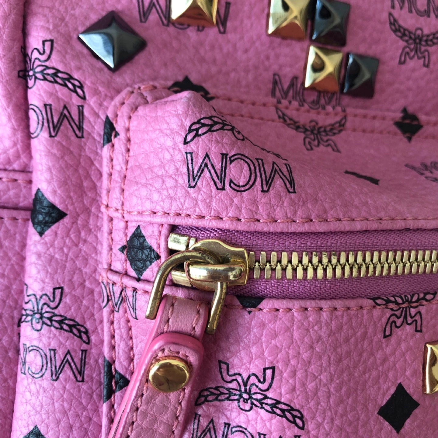 Pink MCM Stark backpack. Visetos monogram. Gold and gunmetal studs.