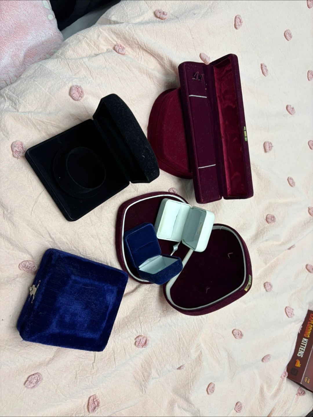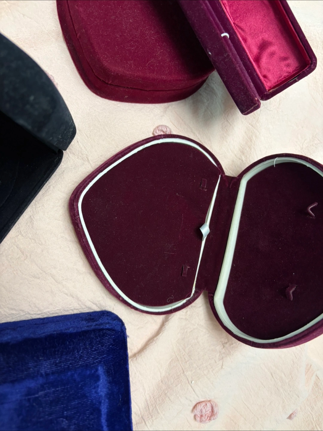 Collection of five used velvet jewellery boxes. Various colours and sizes.