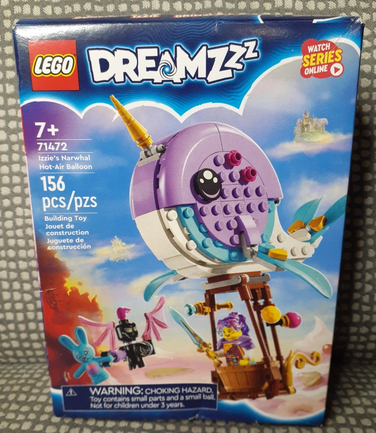 New LEGO DREAMZzz set. Includes 156 pieces. Ages 7+. Build Izzie's Narwhal Hot-Air Balloon. Features minifigures and accessories.
