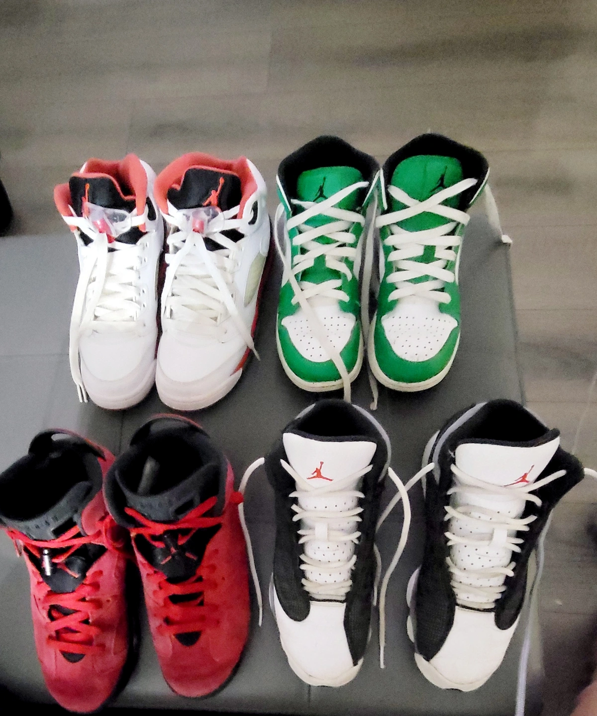 children's footwear. a pair of pink UGG boots with rainbow trim, and three pairs of Nike Jordan high-tops in various colours and styles. Pre-owned, good condition. Sizes vary. 35 each.