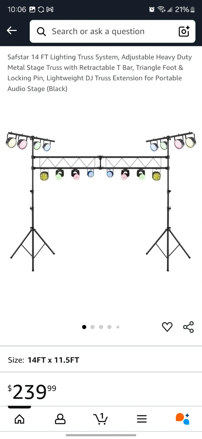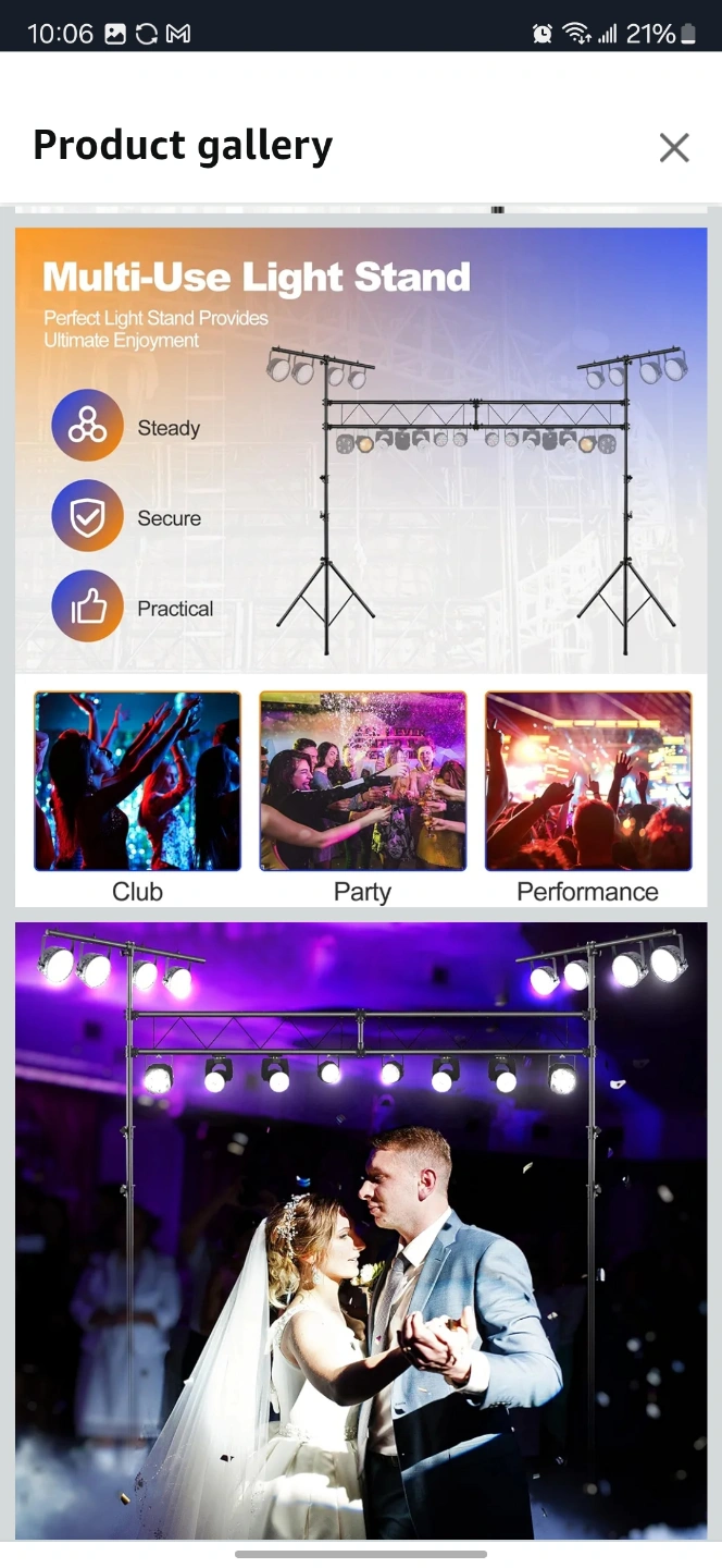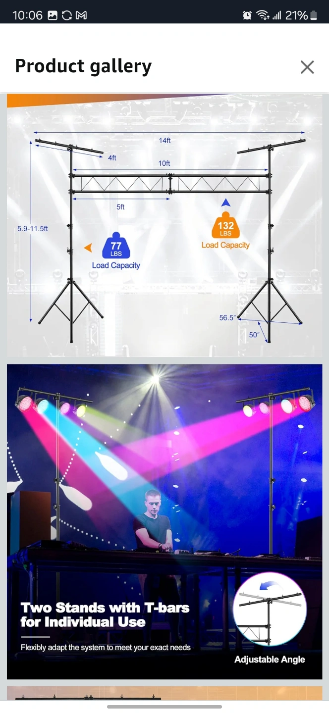 Adjustable heavy-duty metal stage truss with retractable T-bar. Triangle foot & locking pin. Lightweight DJ truss extension for portable audio stage. Black. Two stands with T-bars for individual use. Flexibly adapt the system to meet your exact needs. Adjustable angle. Multi-use light stand. Perfect light stand provides ultimate enjoyment. Steady, secure, practical. Large capacity T-bar to light the whole stage. Holds up to eight lights. Regular light stand holds only two lights. Premium metal tube. Stable non-slip triangular leg.