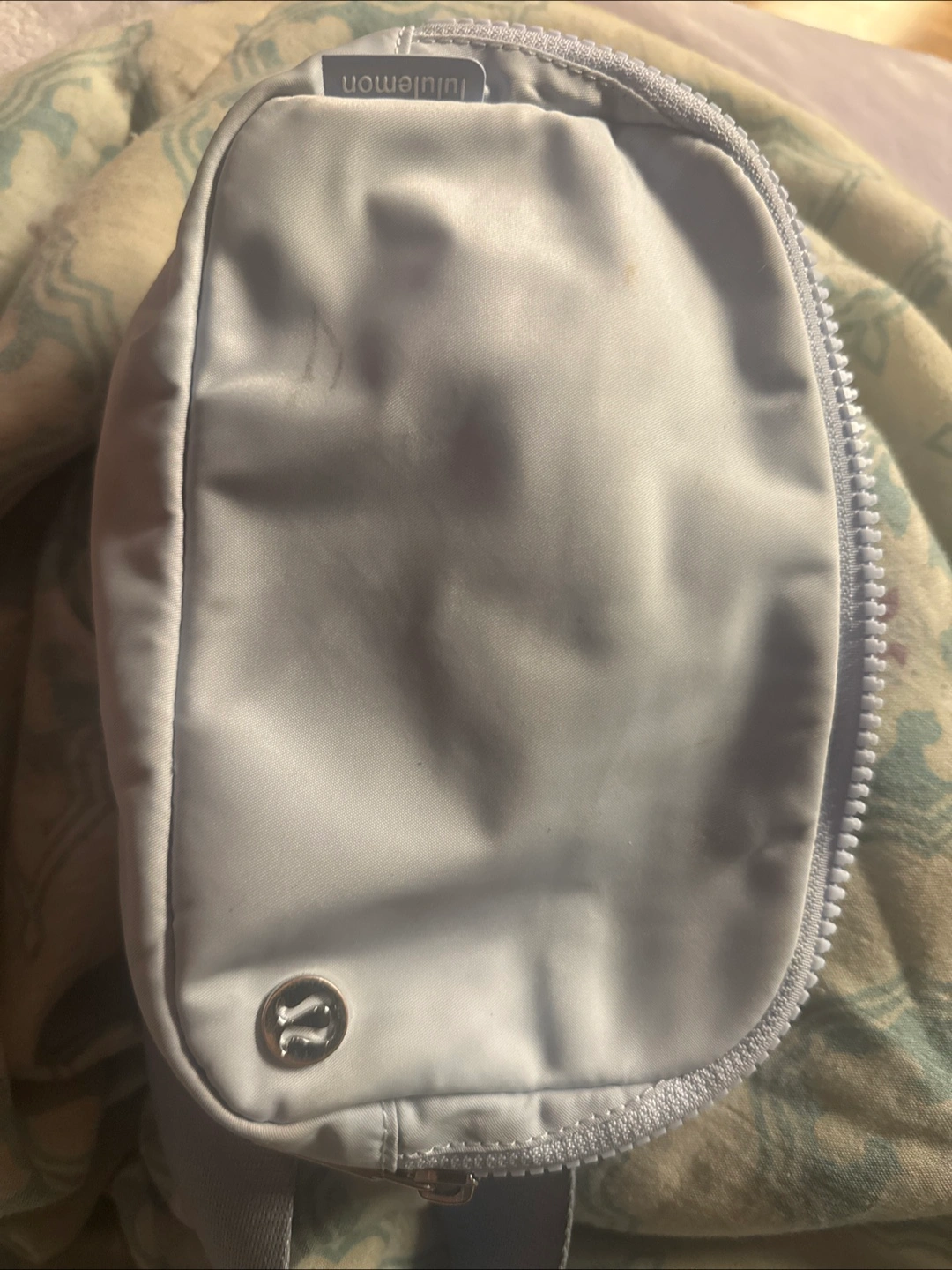 Small, light blue Lululemon belt bag. Adjustable strap. Zipper closure. Great for carrying essentials. Good condition other than small stain which is visible in photo, retails at $55, asking $15 firm.