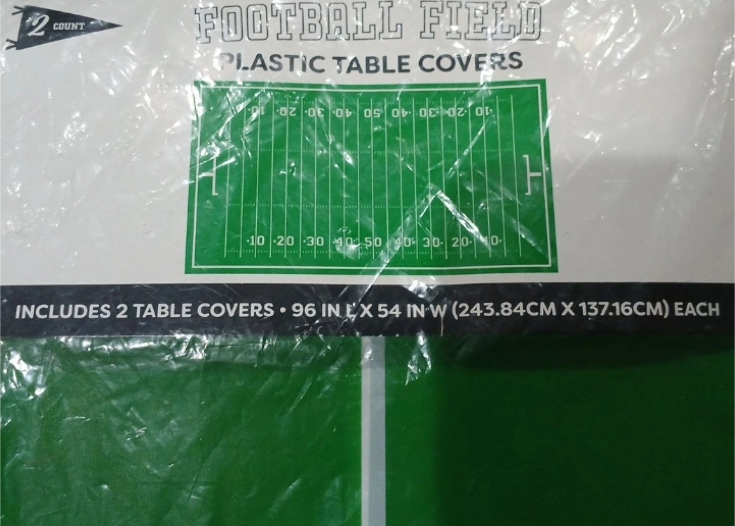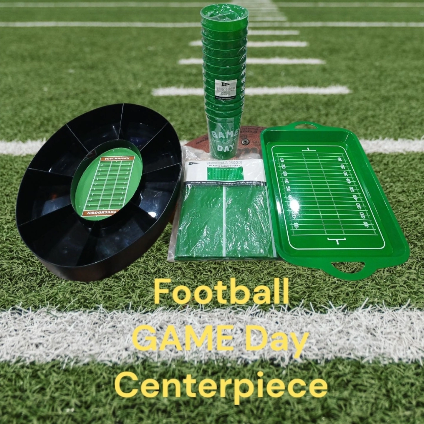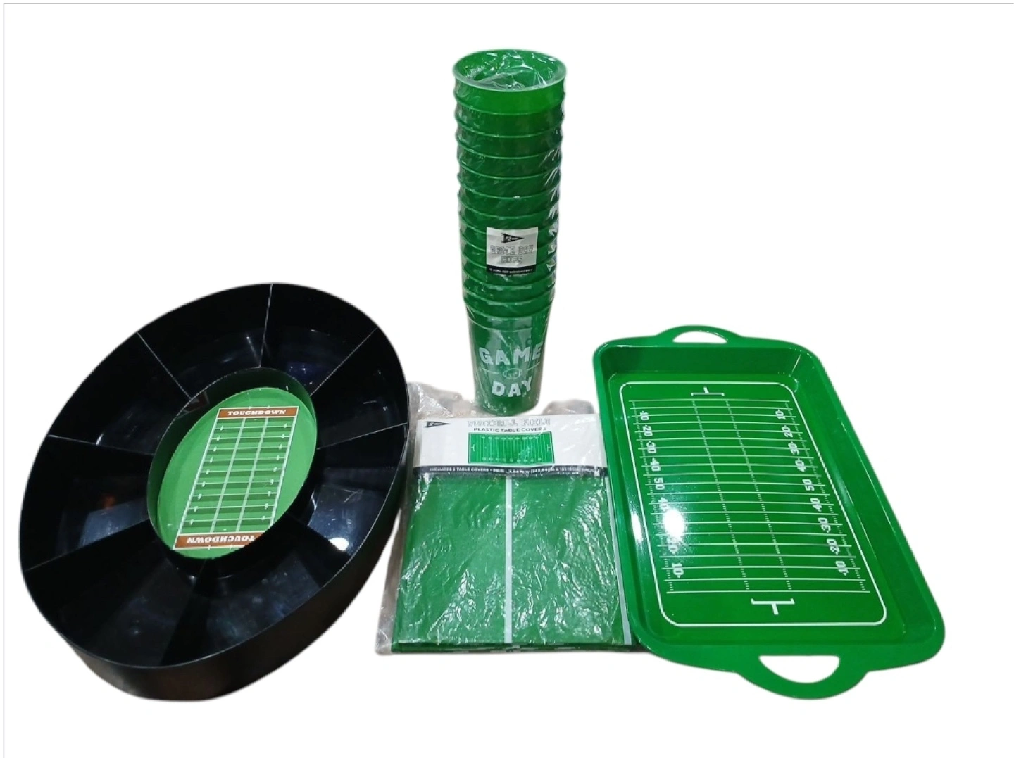 Green football-themed party supplies. Includes cups, table covers, and serving tray. Perfect for game day parties.