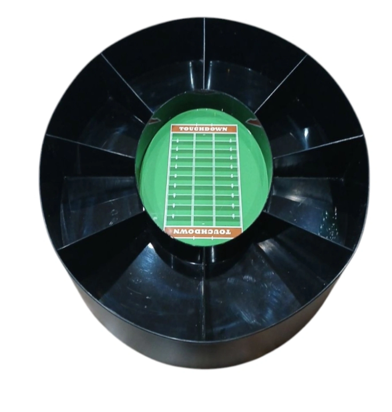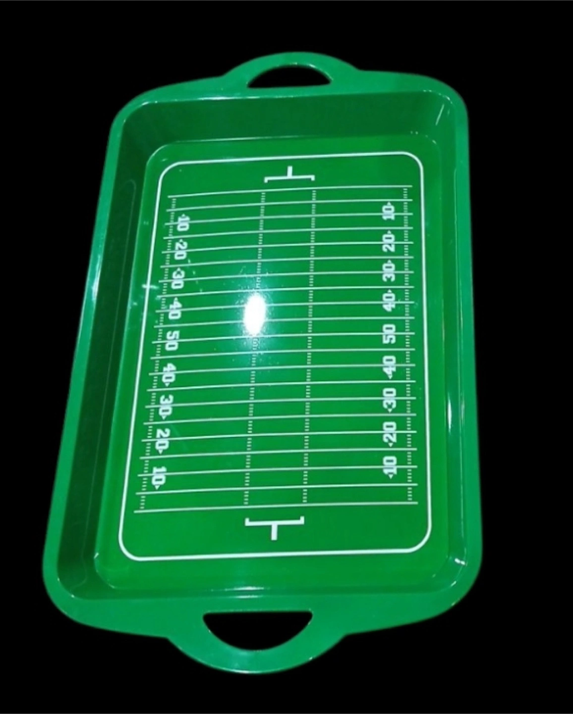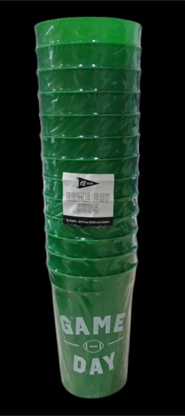Green football-themed party supplies. Includes cups, table covers, and serving tray. Perfect for game day parties.