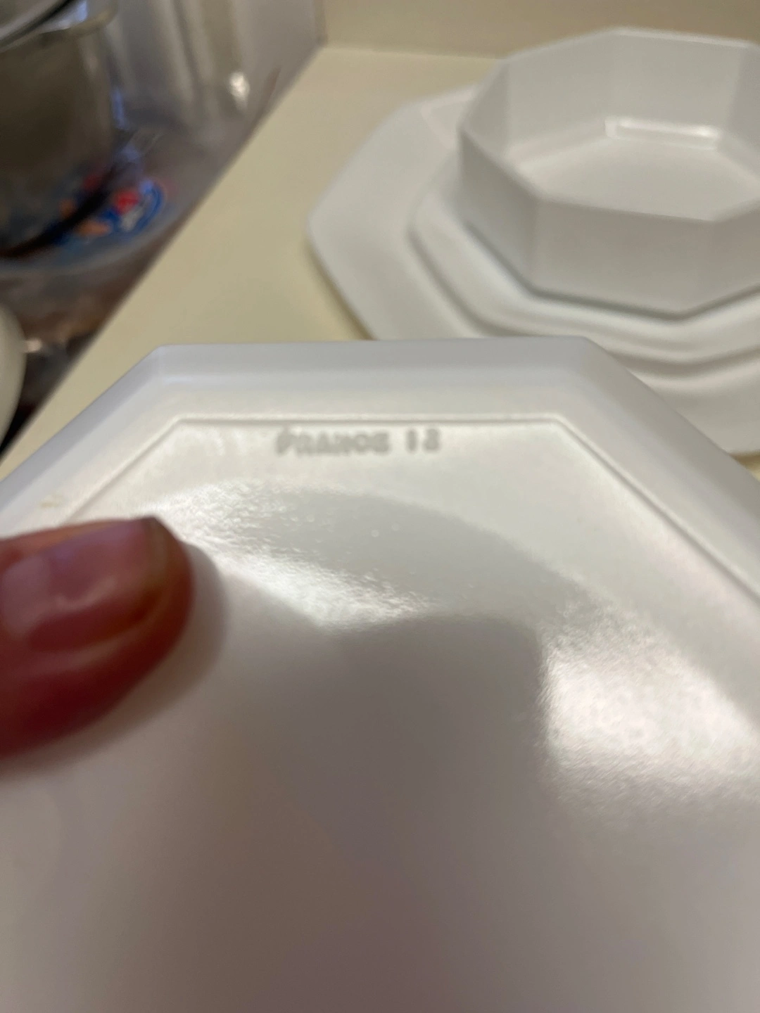 Two vintage Franciscan Desert Rose octagon shaped dinner plates and bowls. White color. Perfect for a casual dinner setting.