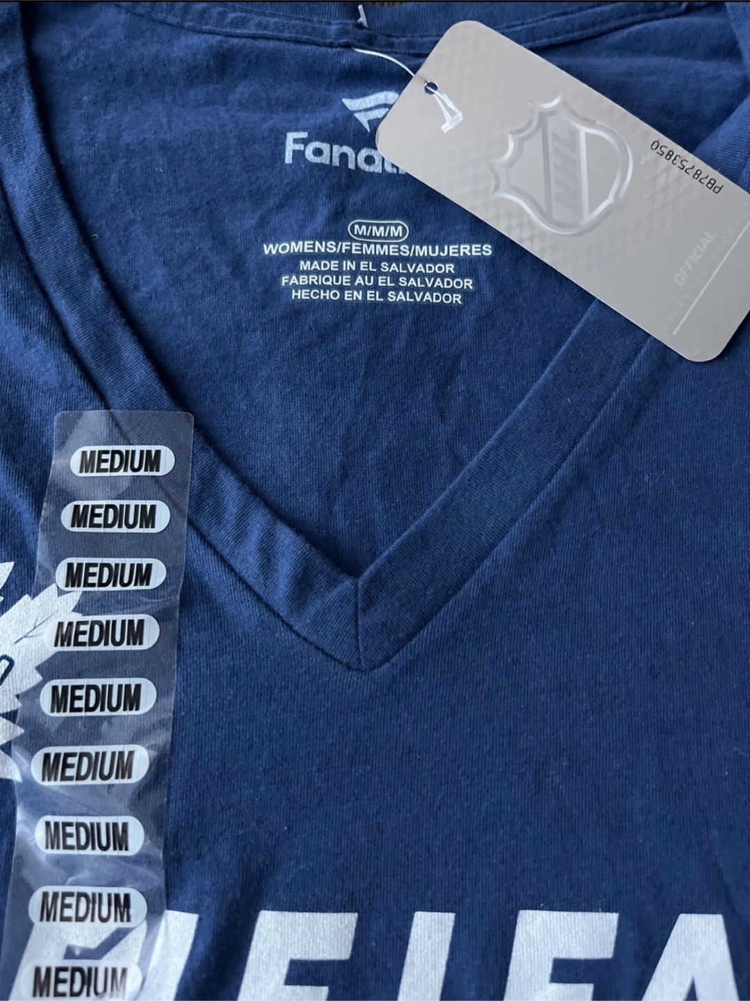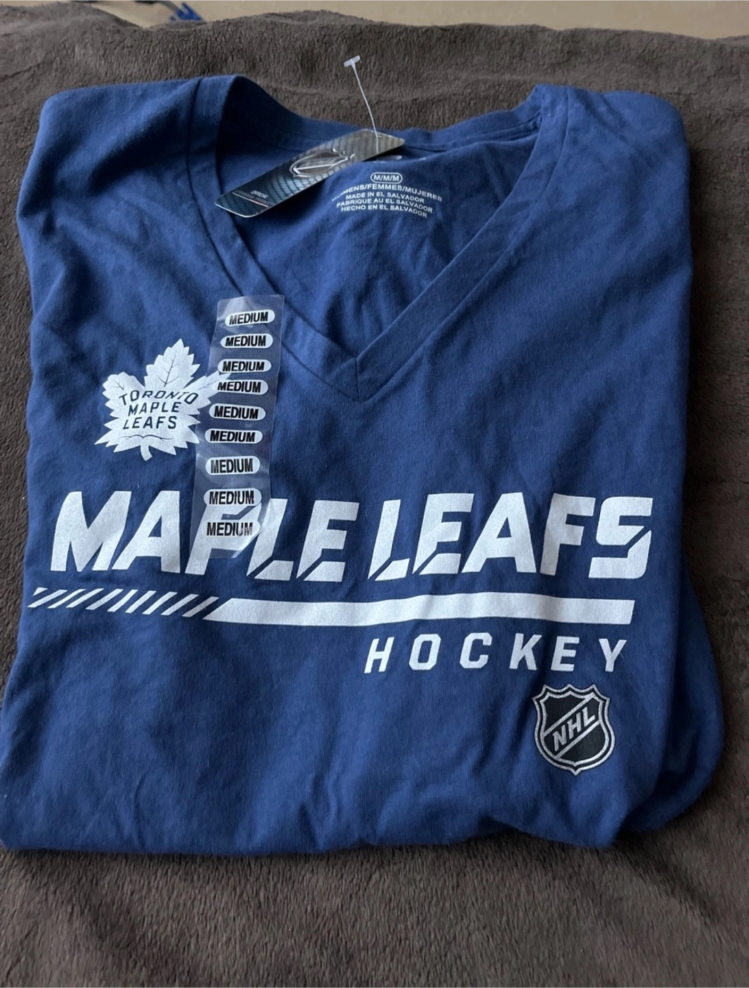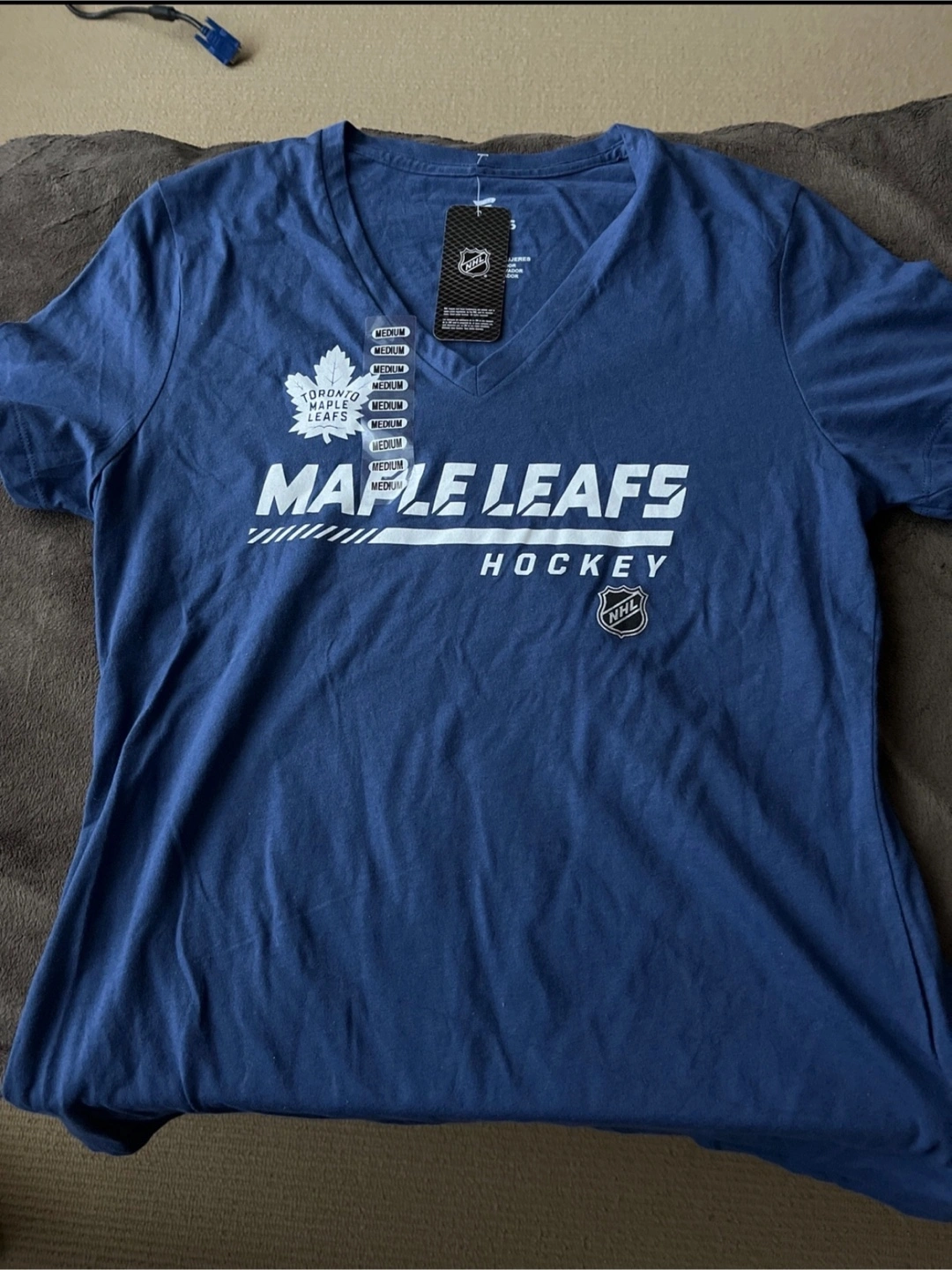 New with tags. Fanatics-branded Toronto Maple Leafs hockey t-shirt. Dark blue v-neck, medium size. NHL logo.