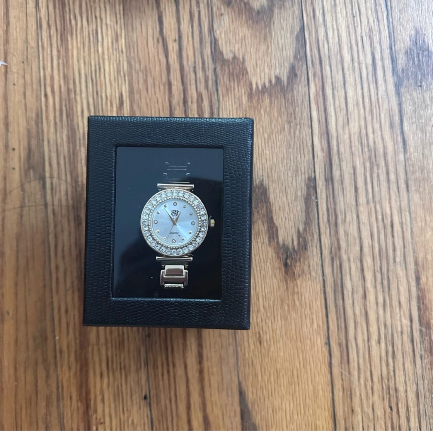 Gorgeous gold-tone watch. Features a round face, crystal accents, and a bracelet-style band. Comes in original box.