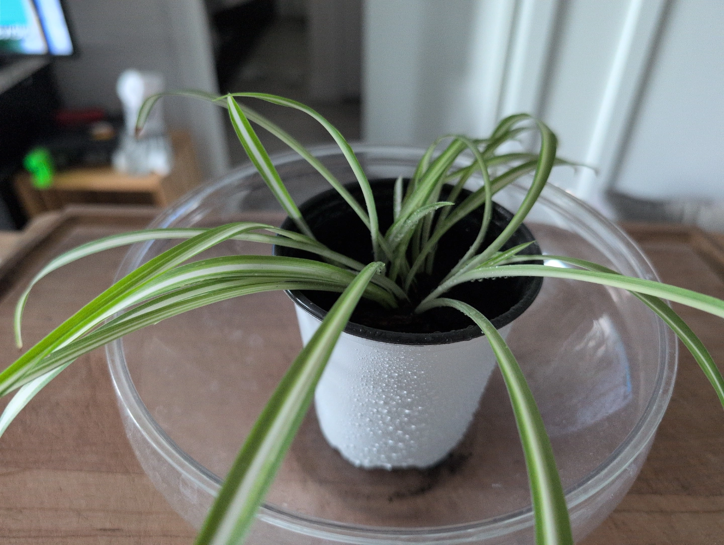 Small spider plant in a white pot. Rooted in water for a few weeks and just freshly potted in soil. Great addition to your home for the spring!