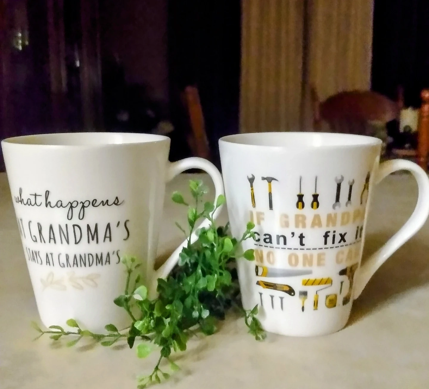 Two ceramic mugs. One features a saying about Grandma. The other features tools and a saying about Grandpa. Great gift for grandparents!