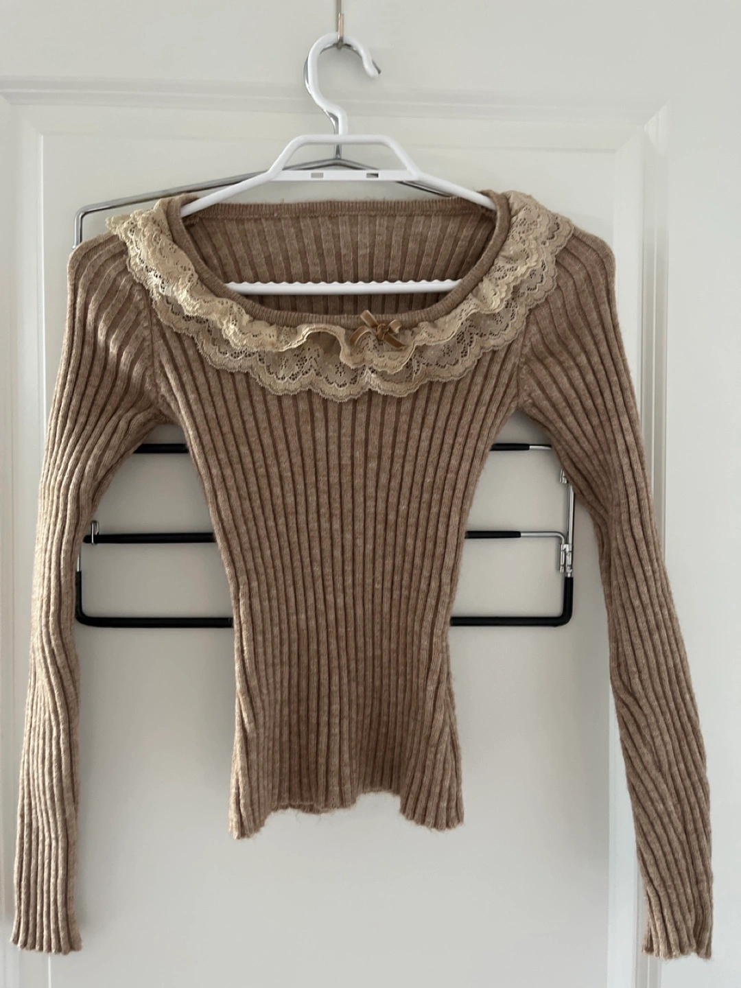 Long sleeve cropped sweater. Features a ribbed knit and a delicate lace collar. Neutral brown colour.