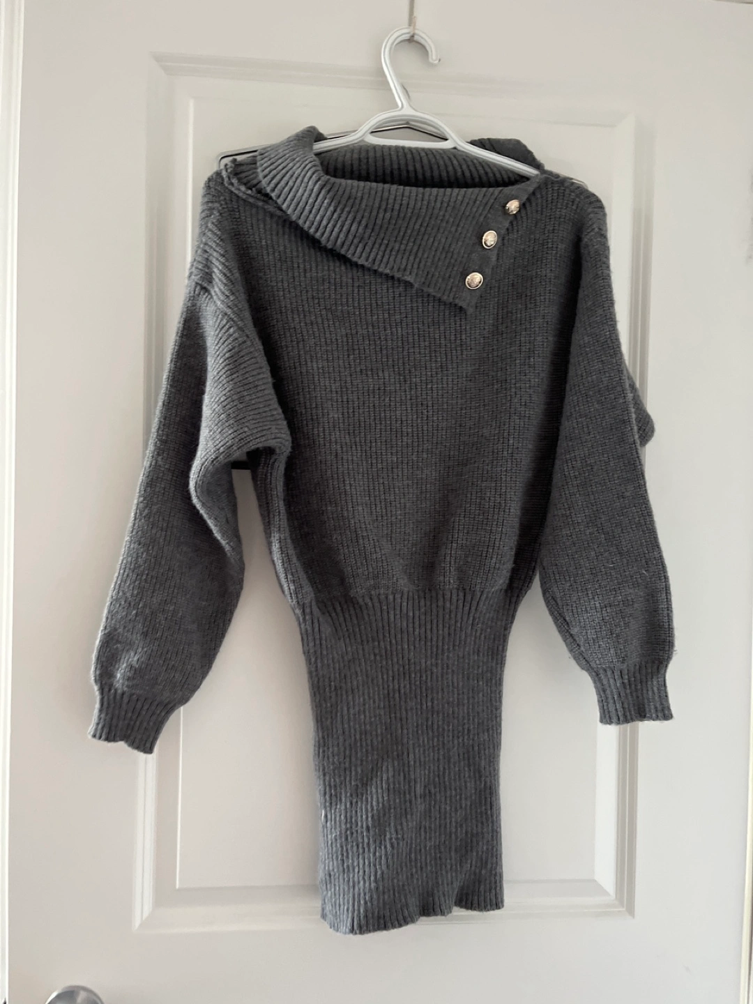 Long sleeve, fitted, grey sweater dress. Features a cowl neck and decorative buttons on the shoulder. Ribbed detail at waist.