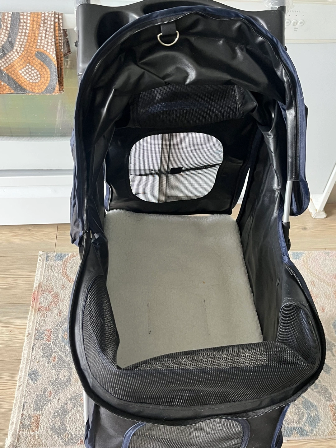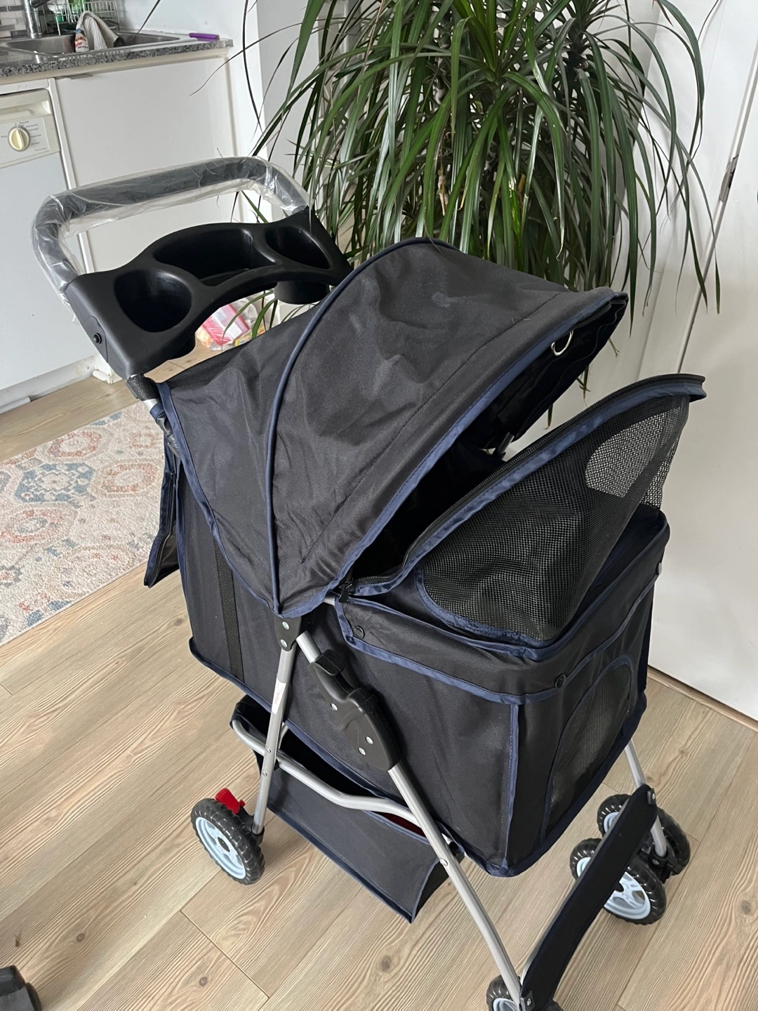 Portable pet stroller. Features a collapsible design, multiple storage compartments, and mesh windows for ventilation. Suitable for small to medium-sized pets. Wheels roll smoothly. Great for walks and outings.