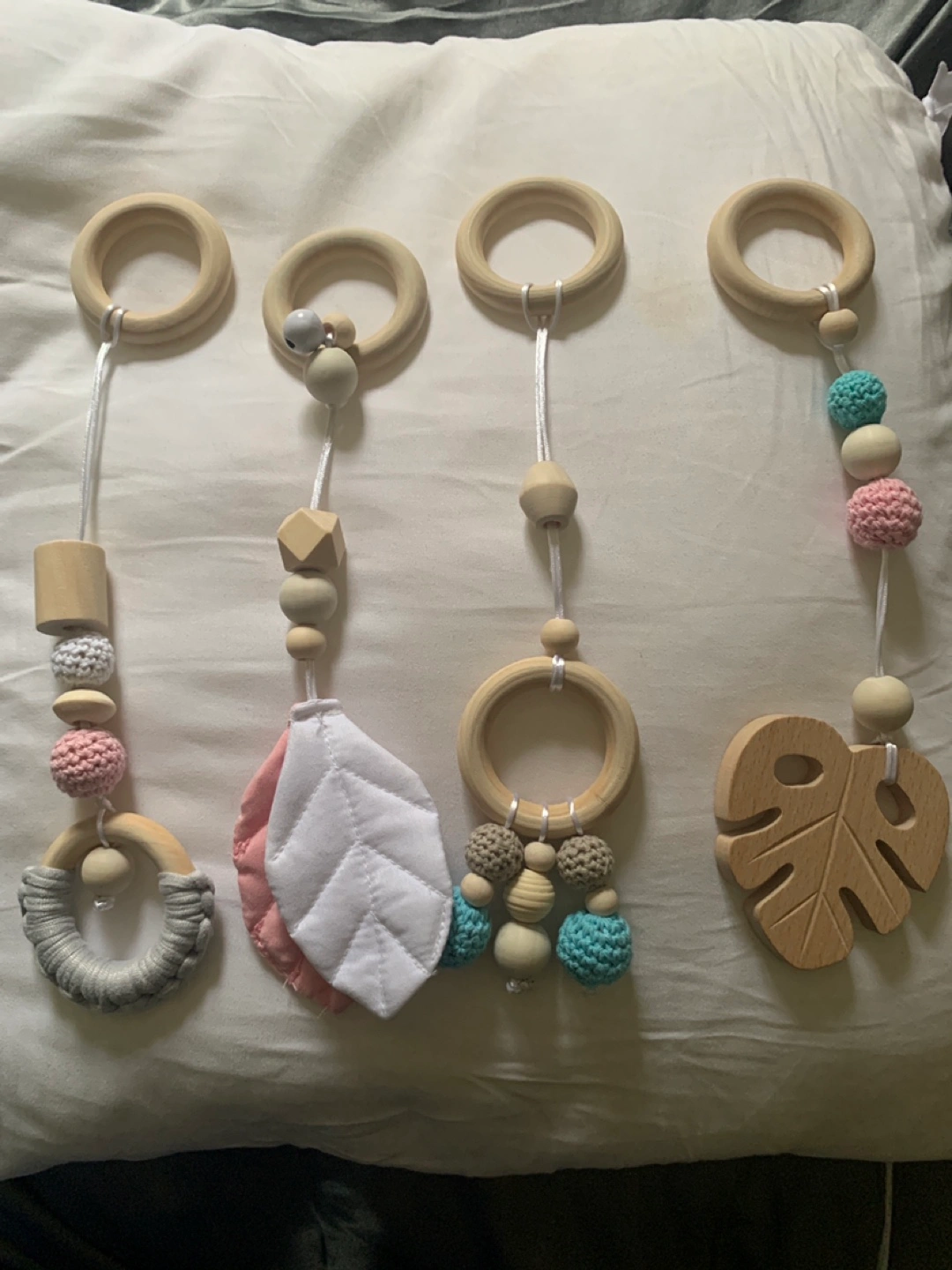 Four wooden baby sensory toys. Each features wooden rings and beads, plus fabric accents. Perfect for engaging little ones.