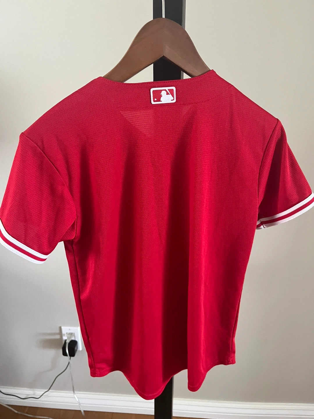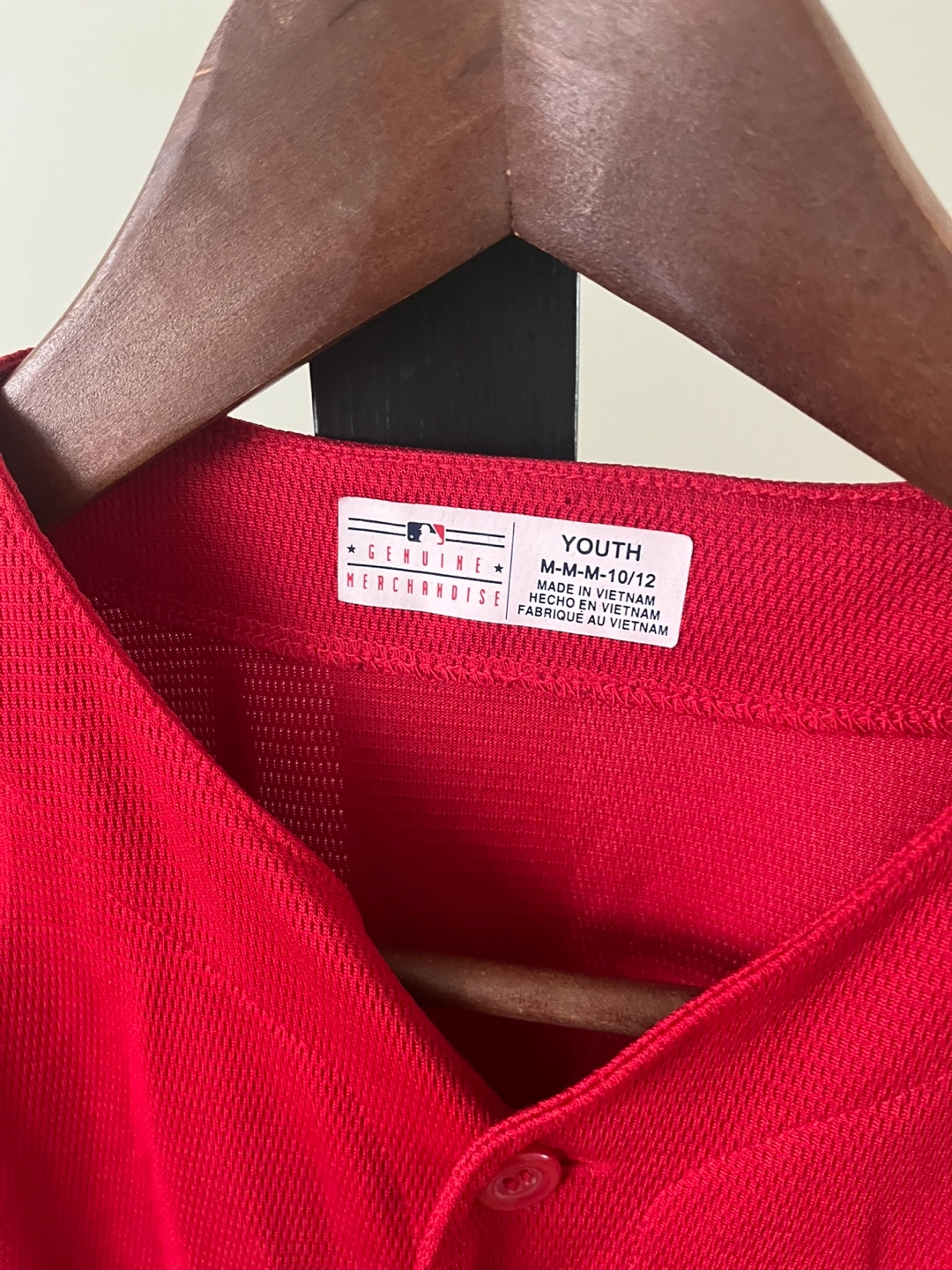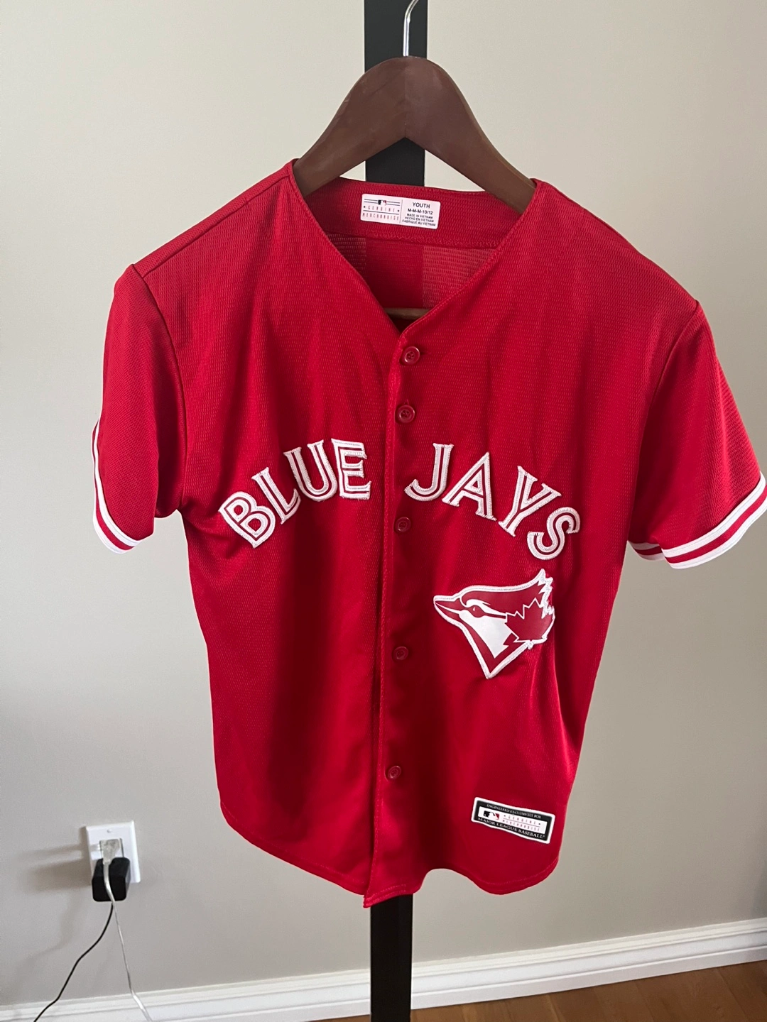 41Red Toronto Blue Jays youth baseball jersey. Size M-M-10/12. Genuine MLB merchandise. Button-up. White lettering and accents. Pick up in Utopia