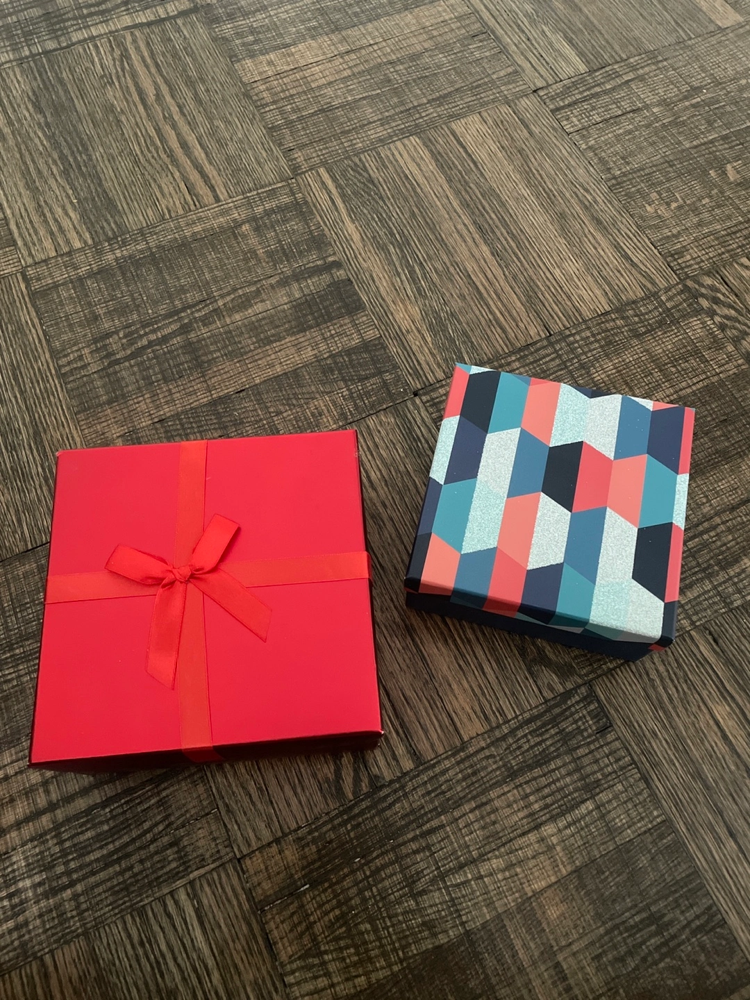 Two empty gift boxes. One red box with a red ribbon. One smaller box with a geometric design. Perfect for regifting or storage.