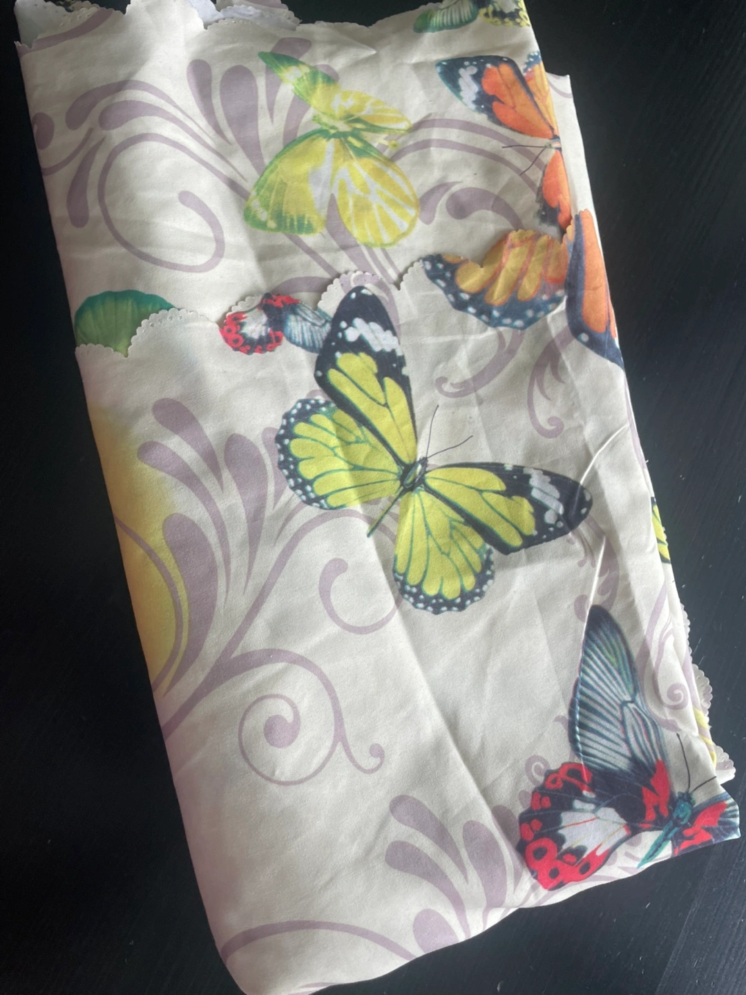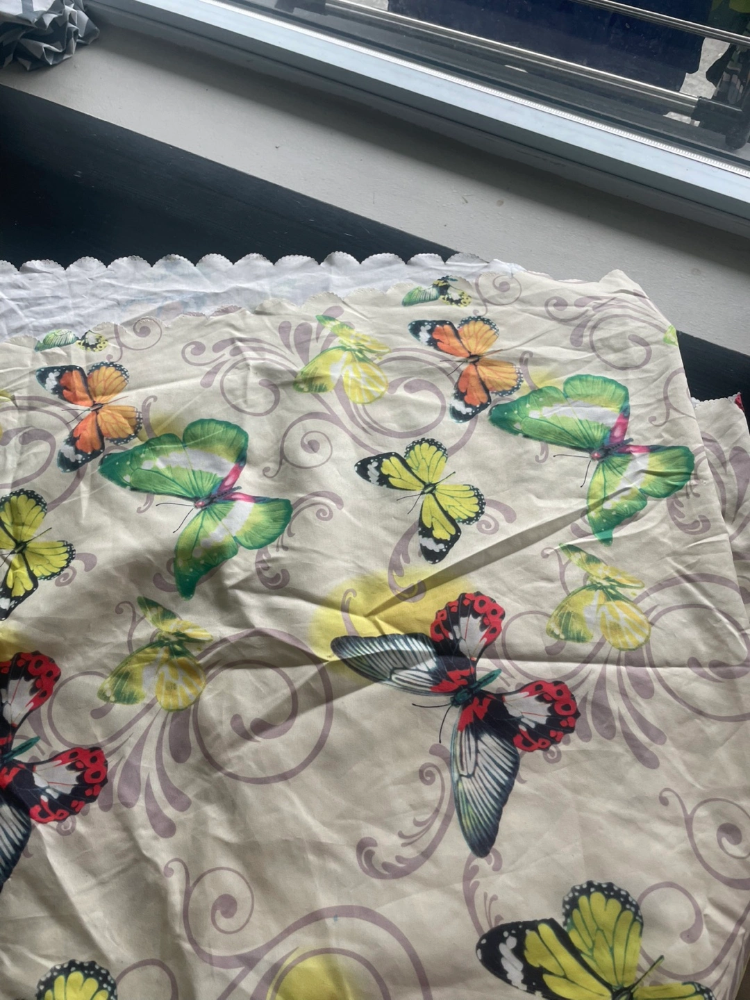 Unused fabric with a scalloped edge. Features colourful butterflies and a floral pattern on a beige background.