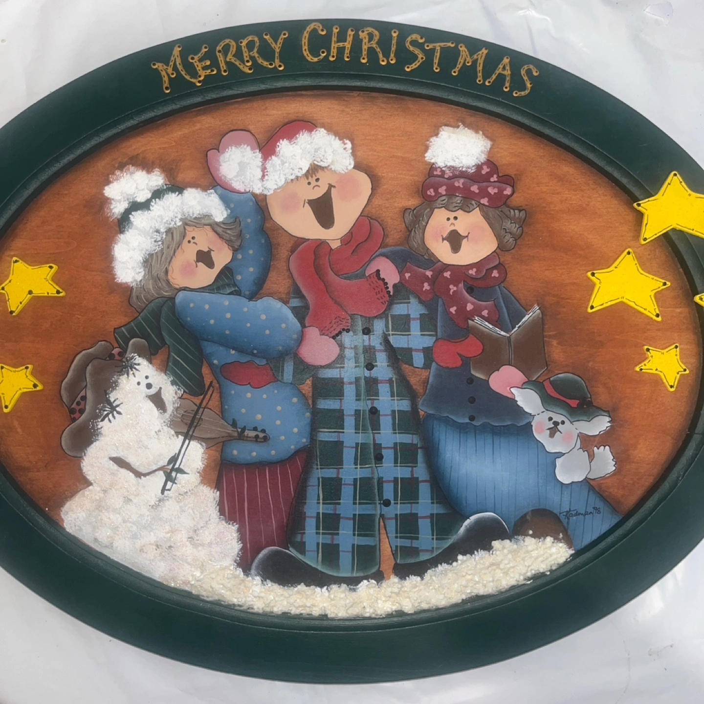 Charming hand-painted wooden plaque. Features a festive scene of carolers, a snowman, and a dog. Oval shape with a dark green frame. Yellow stars surround the image. Merry Christmas written at the top.