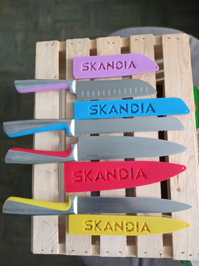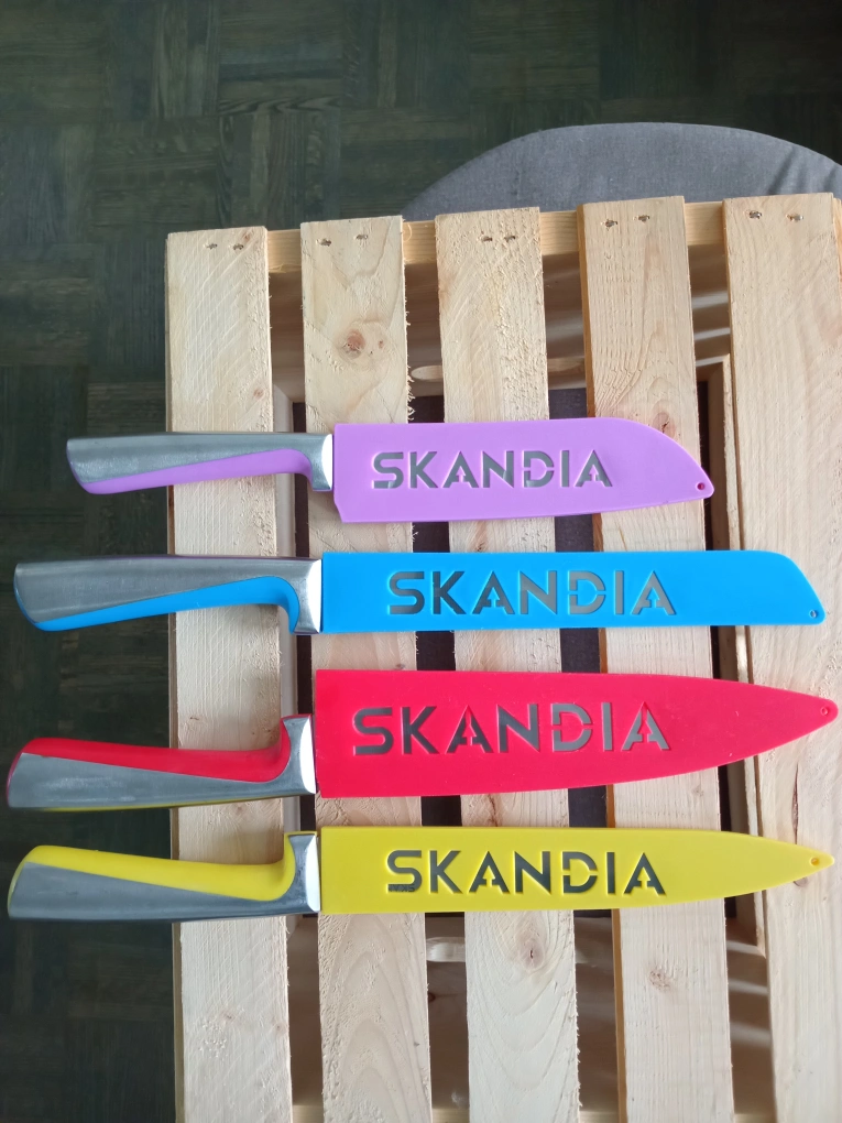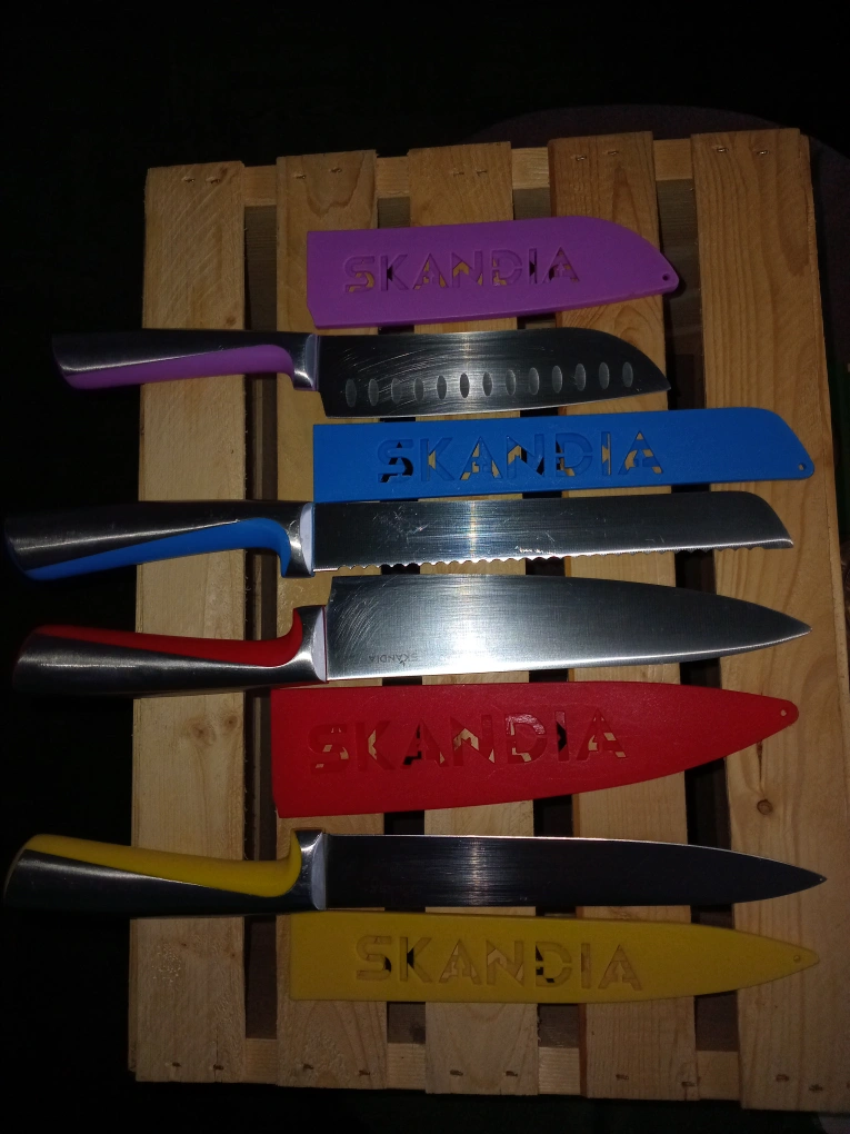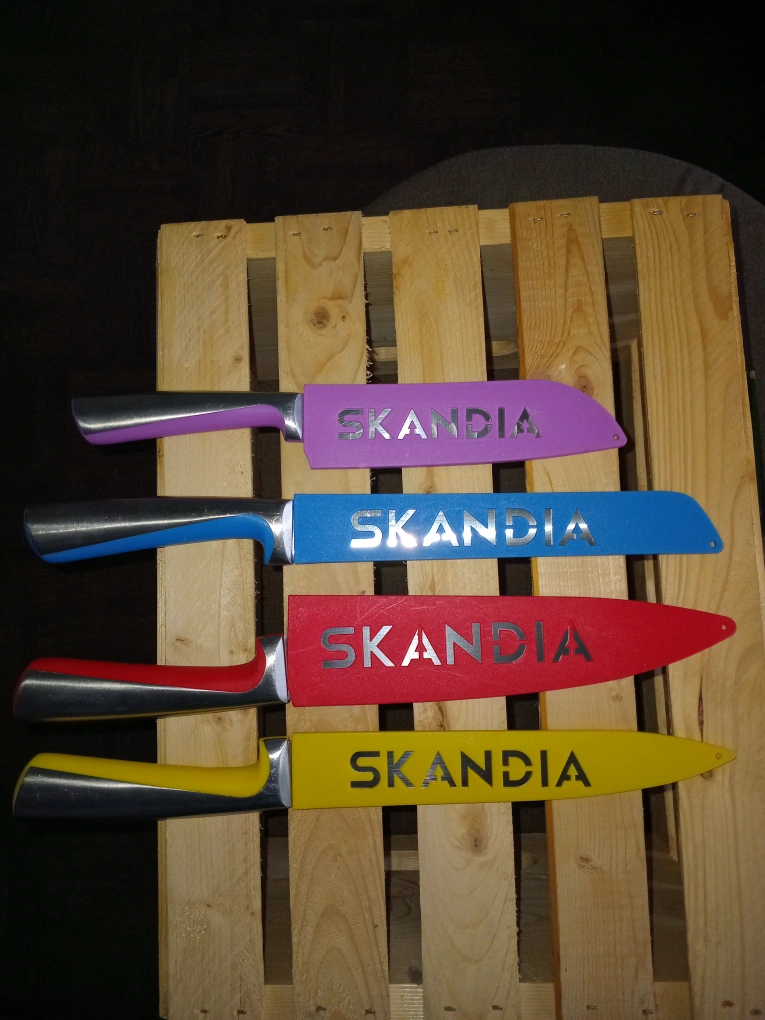 Four Skandia knives, various sizes. Each knife comes with a colour-coded protective sheath. Sheaths are purple, blue, red, and yellow.