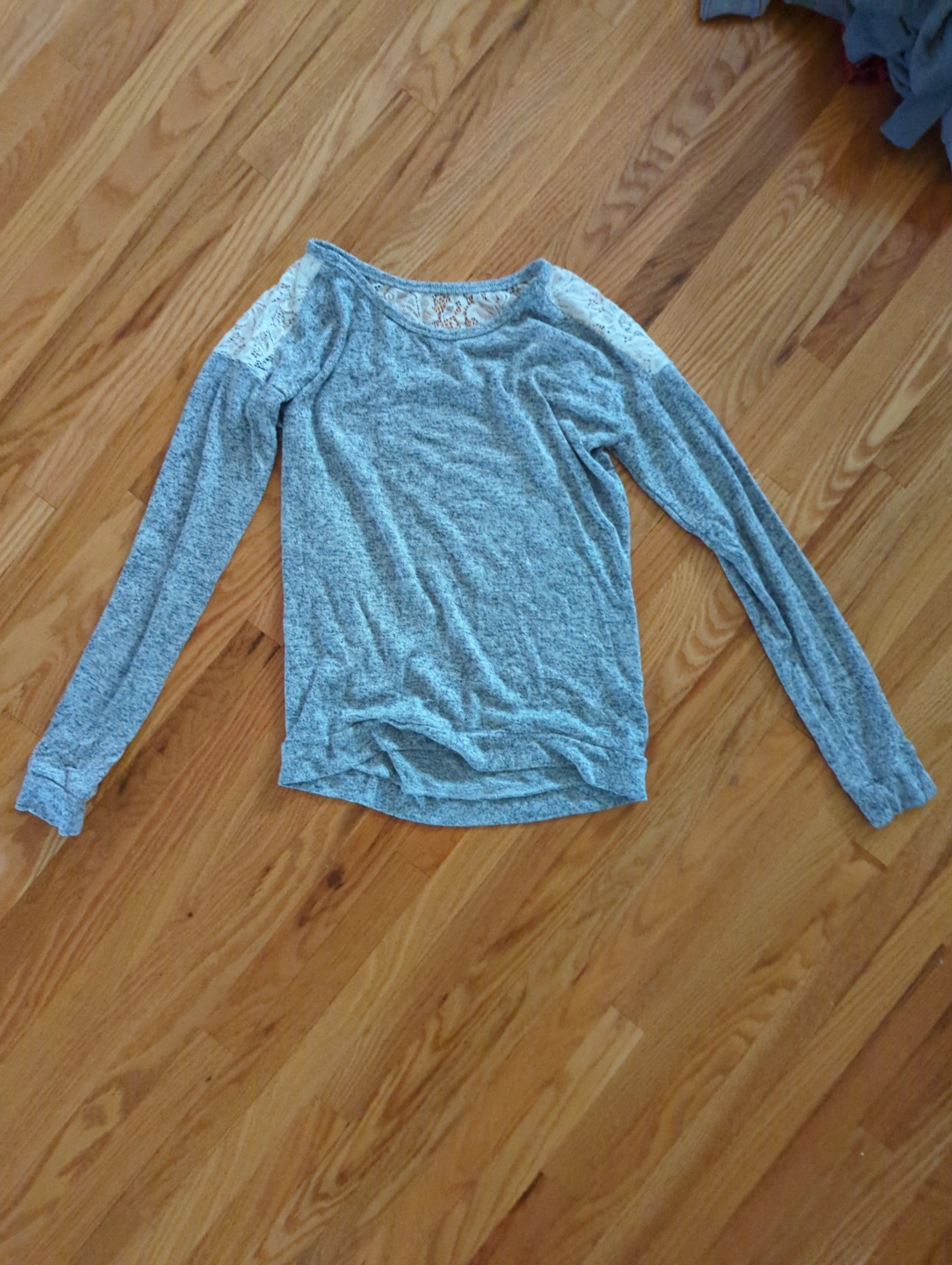 Grey long-sleeved shirt with lace detailing at the neckline and shoulders. Soft material. Great for layering or wearing on its own.