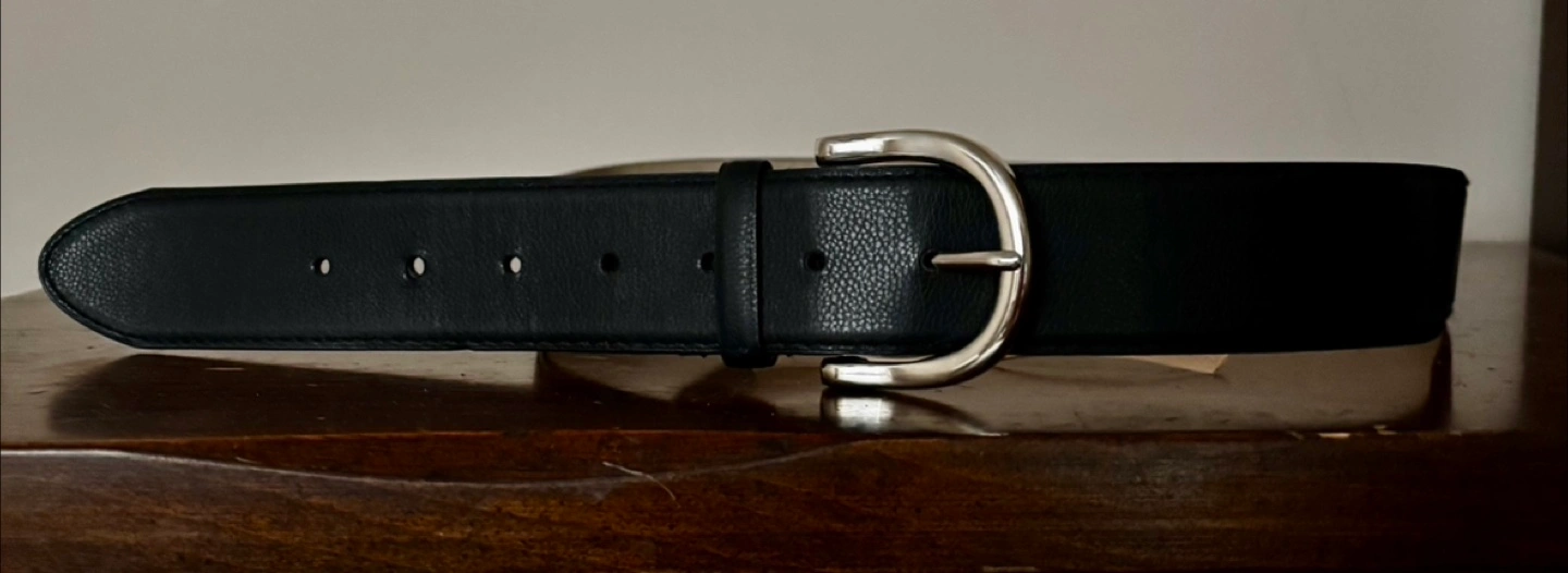 Women's black leather belt. Silver-toned buckle. Five belt holes. Classic style,