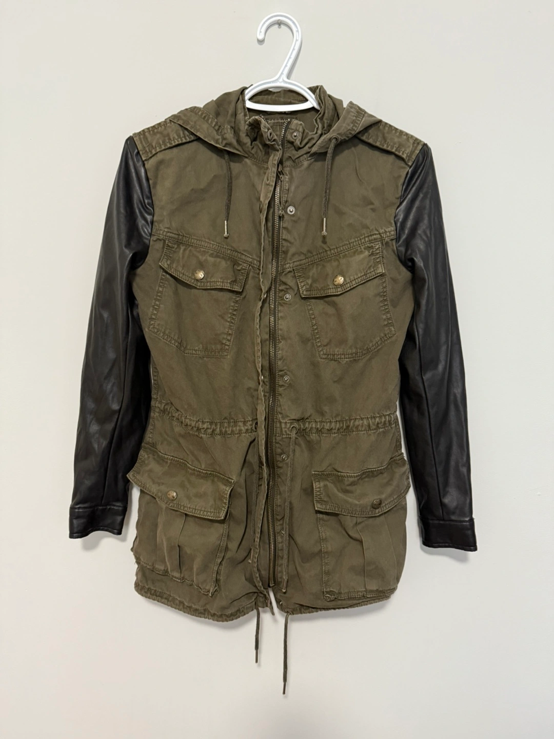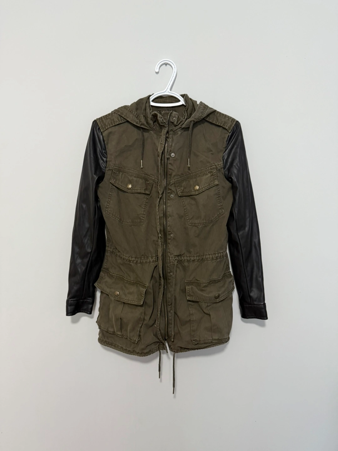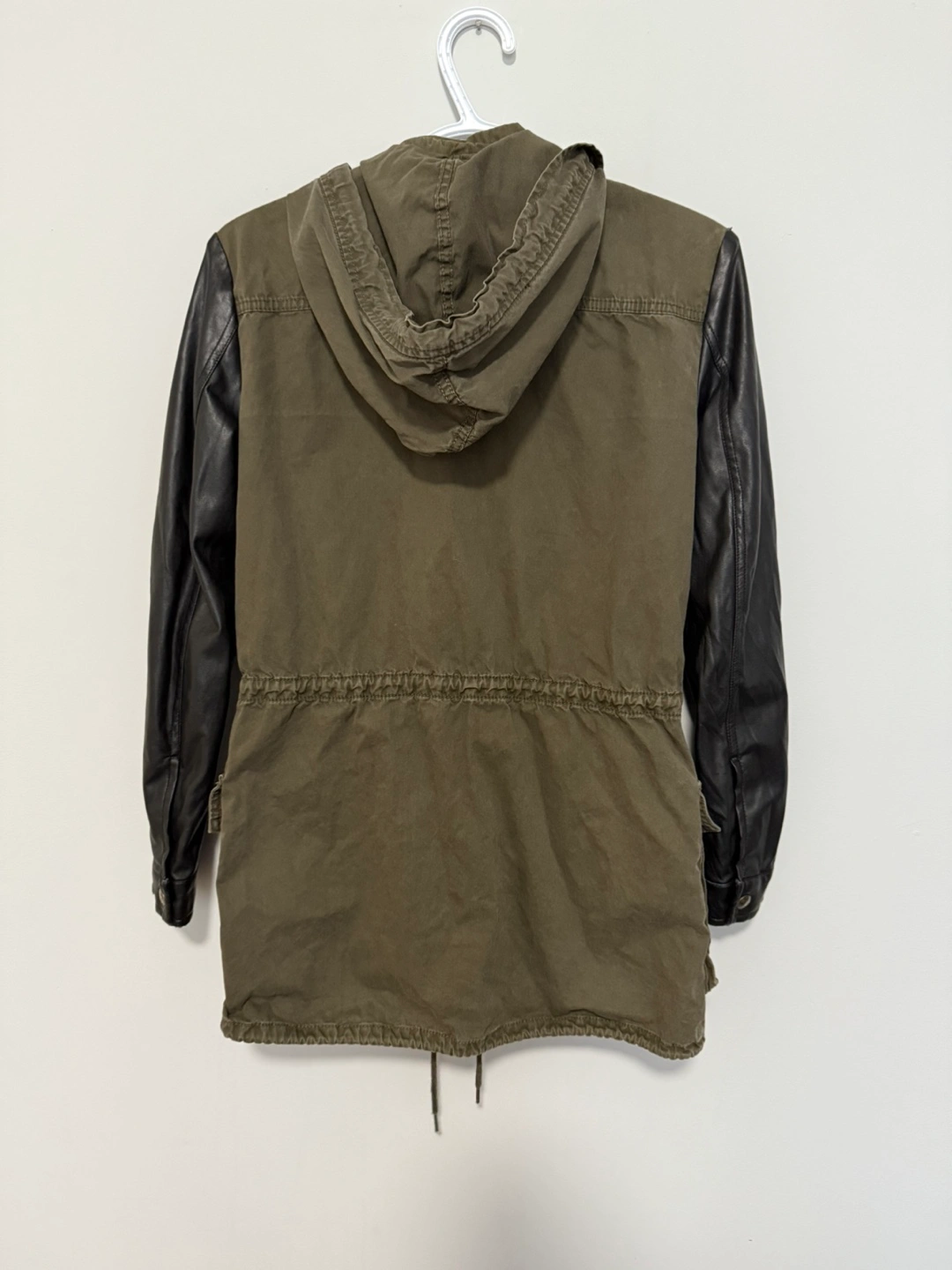 Women's olive green anorak jacket. Features a drawstring waist, multiple pockets, and faux leather sleeves. Hooded design. Zipper and button closure.
