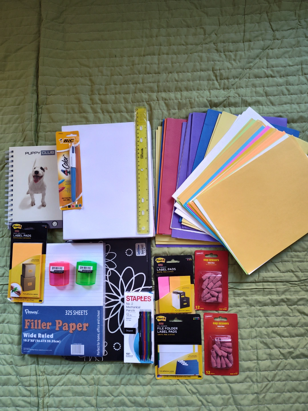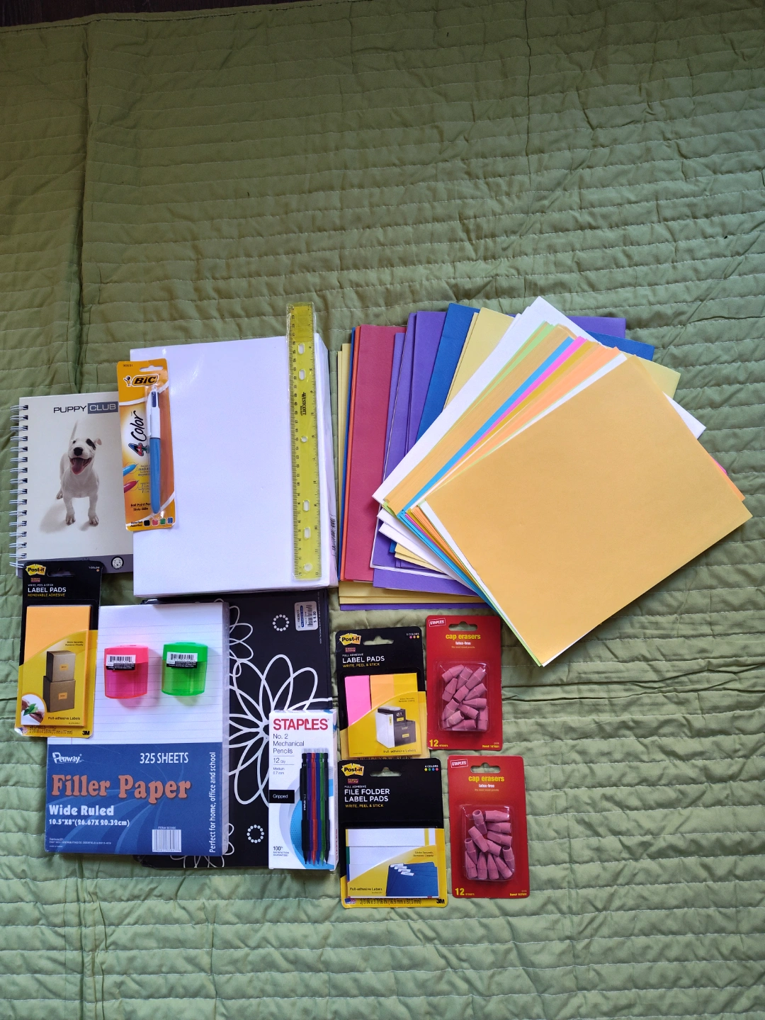 Large bundle of office supplies. Includes wide-ruled filler paper, copy paper, mechanical pencils, folder, and more. Perfect for students or office use. See images for details.