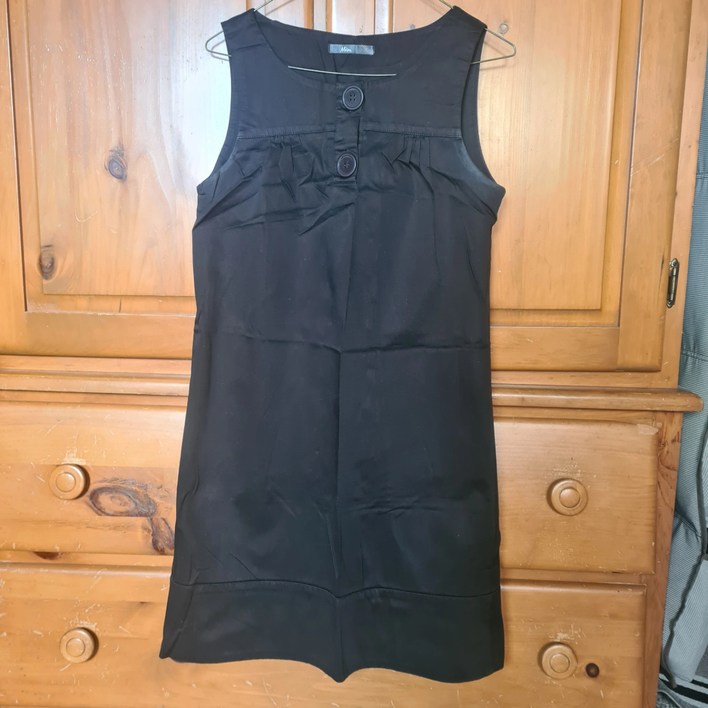 Simple black mini dress. Features a button placket and sleeveless design. Good for summer or a night out.