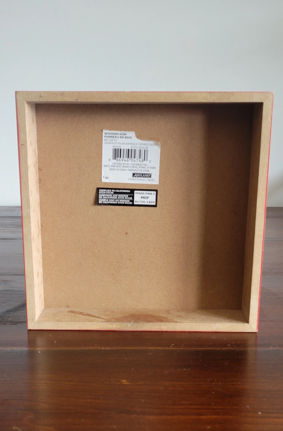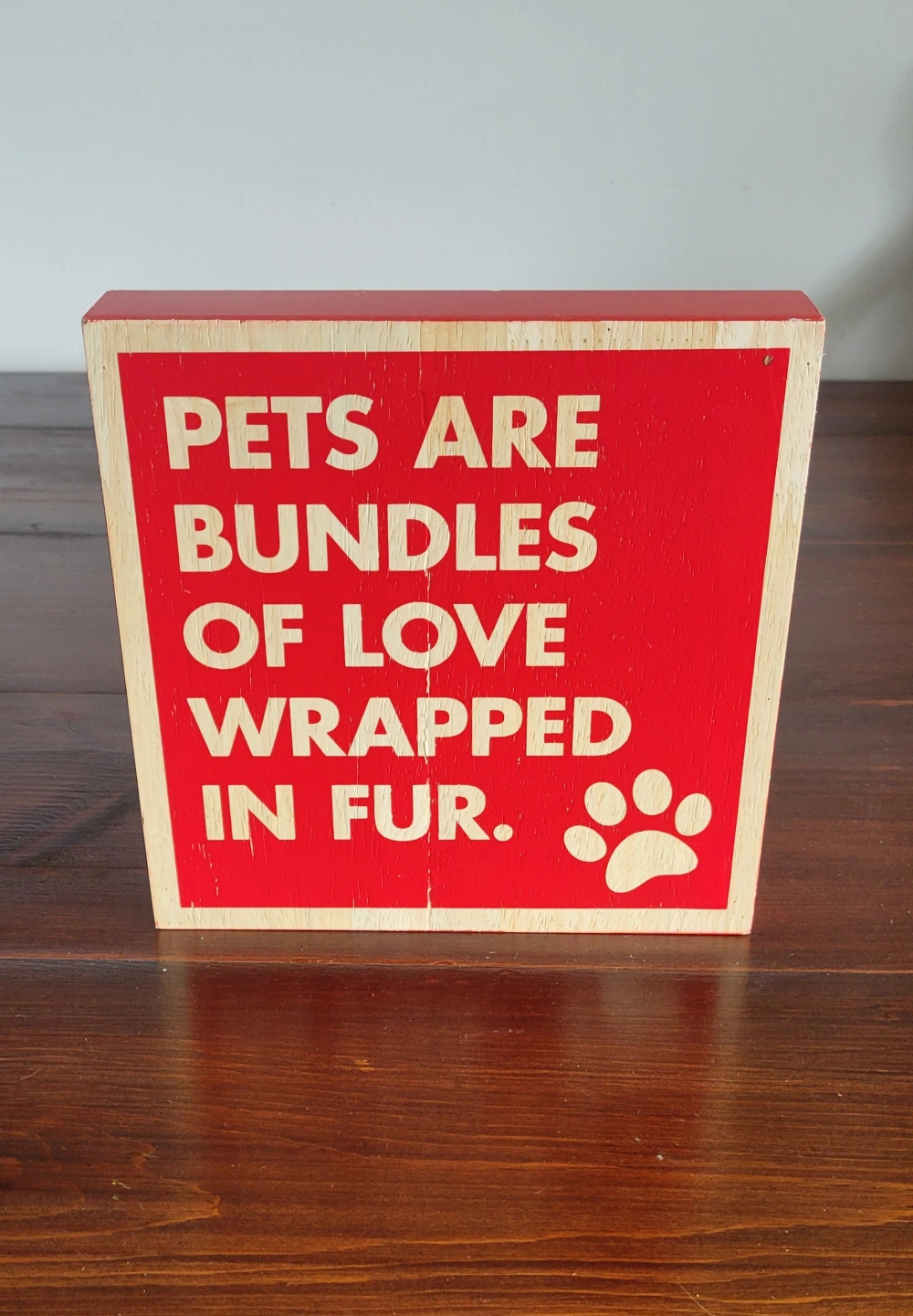 Cute wooden sign. Red background with beige lettering. Features a paw print. Perfect for pet lovers.
