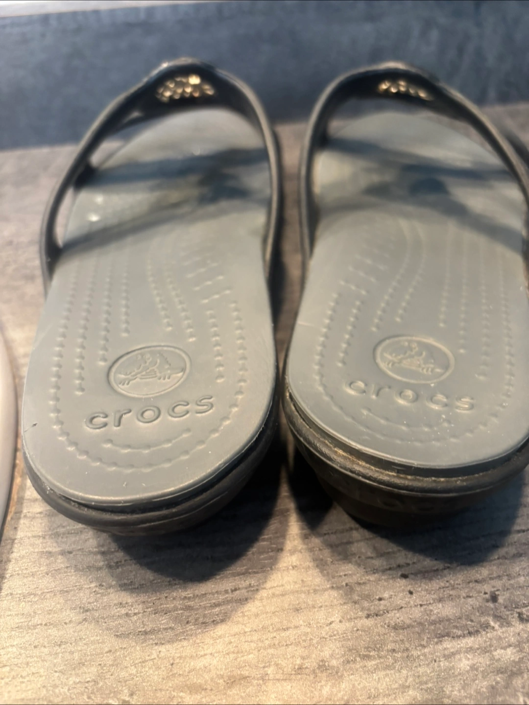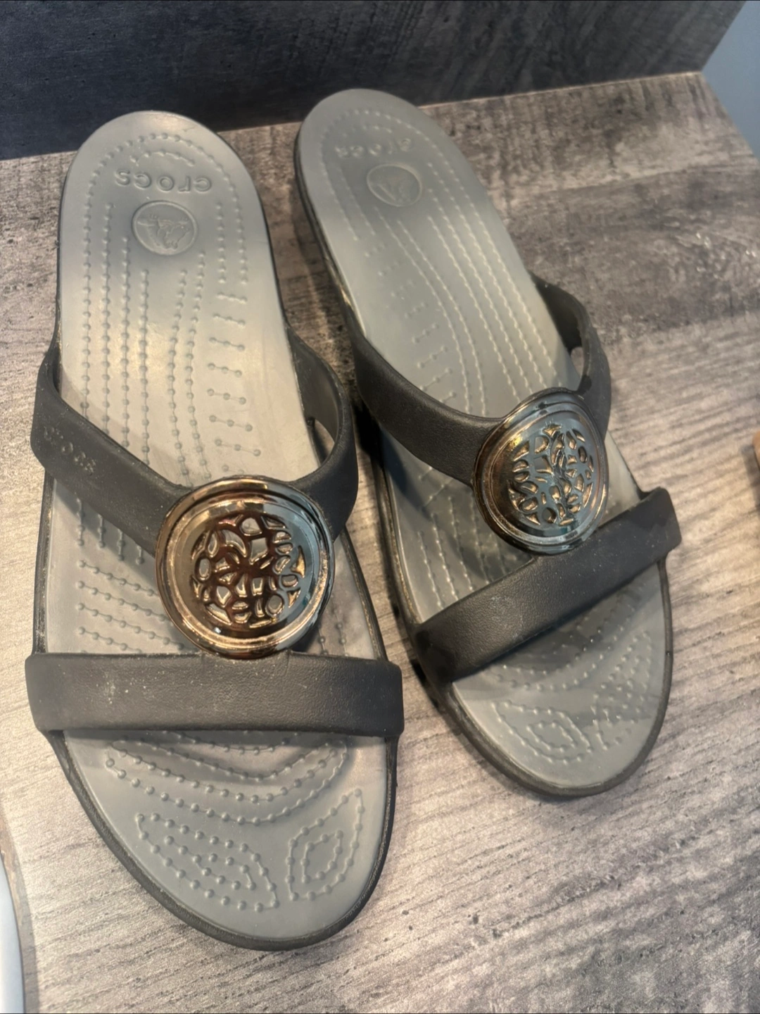 Crocs Black and Grey Wedge Sandals with Gold Detail