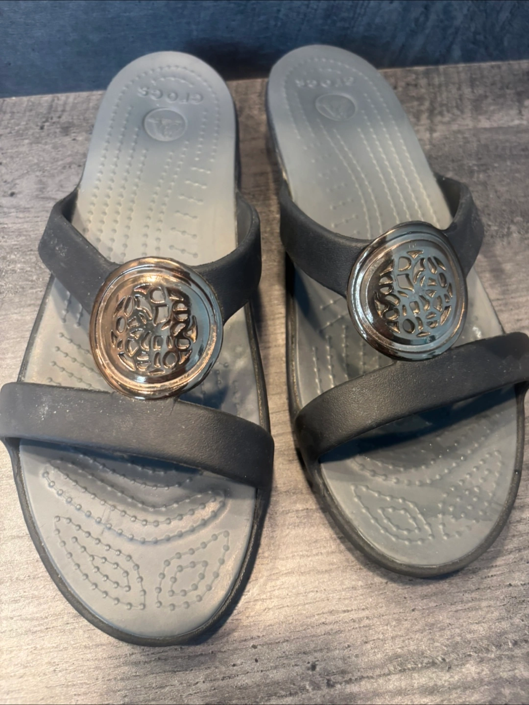 Crocs Sanrah Women’s Sandals Size W 11 Slides Medallion Ring Wedge Black Gray