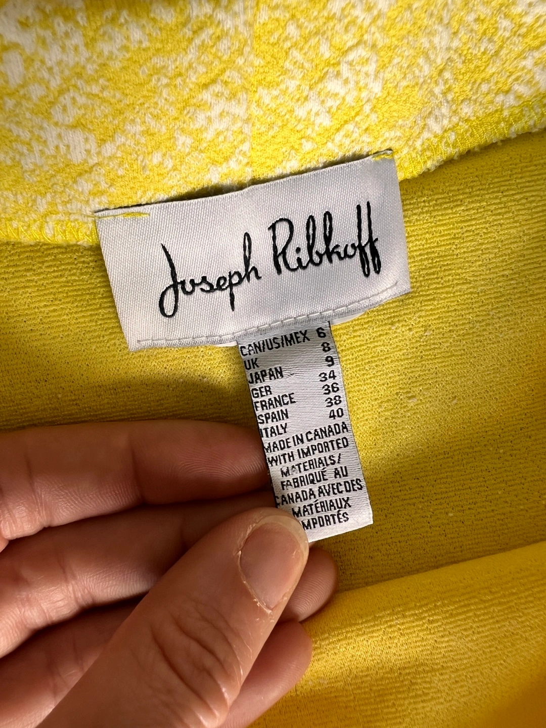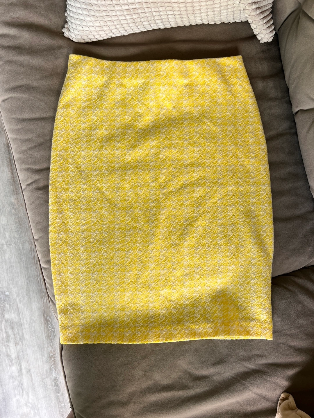 Beautiful yellow pencil skirt. Subtle white pattern. Made in Canada!!!! Size 6 but comfortable stretch