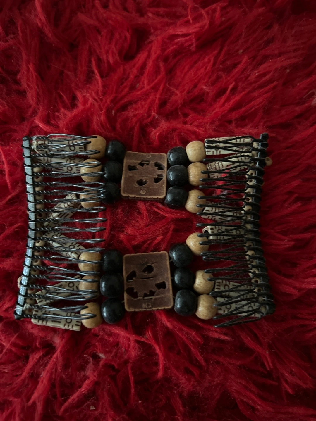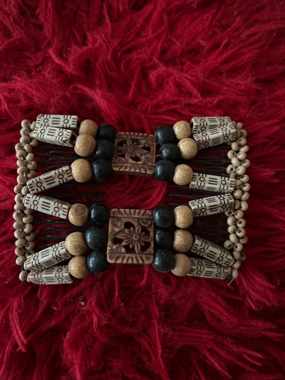 396Pair of decorative hair combs. Wooden beads and carved accents. Black and light brown colour scheme. Great for styling.