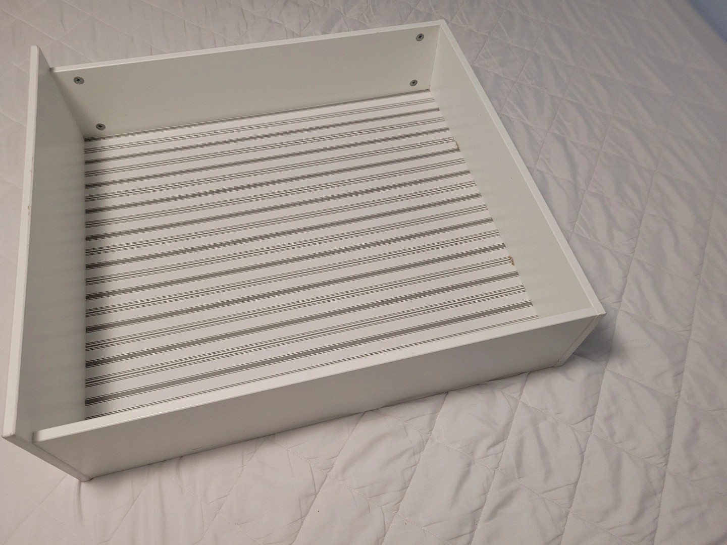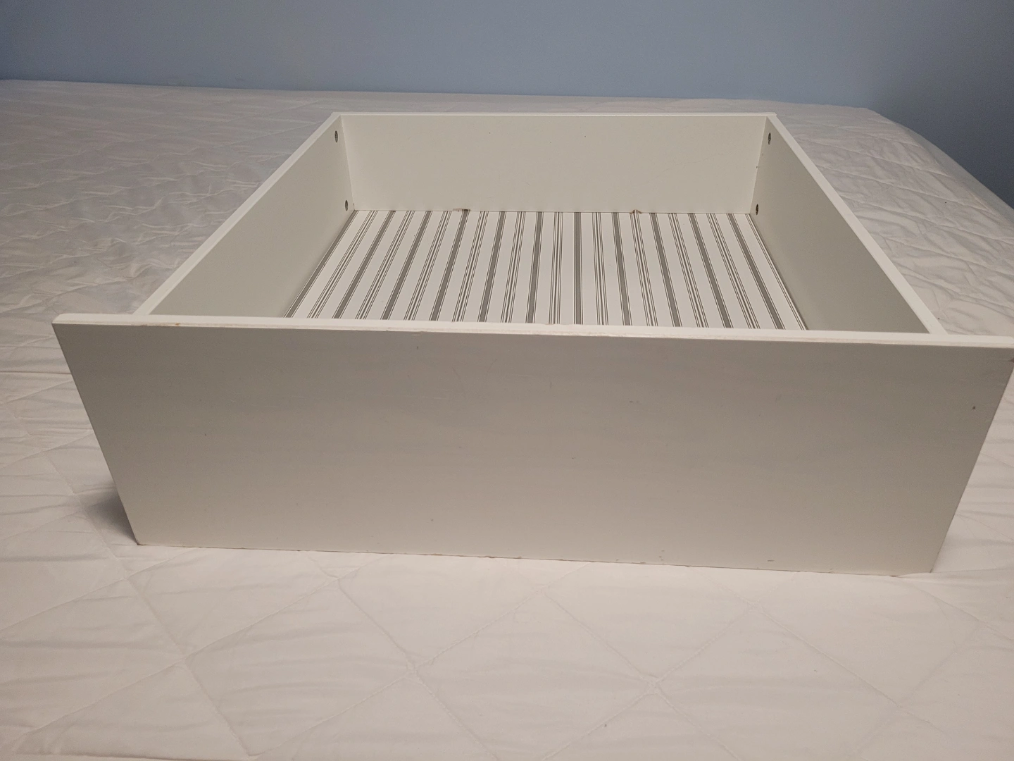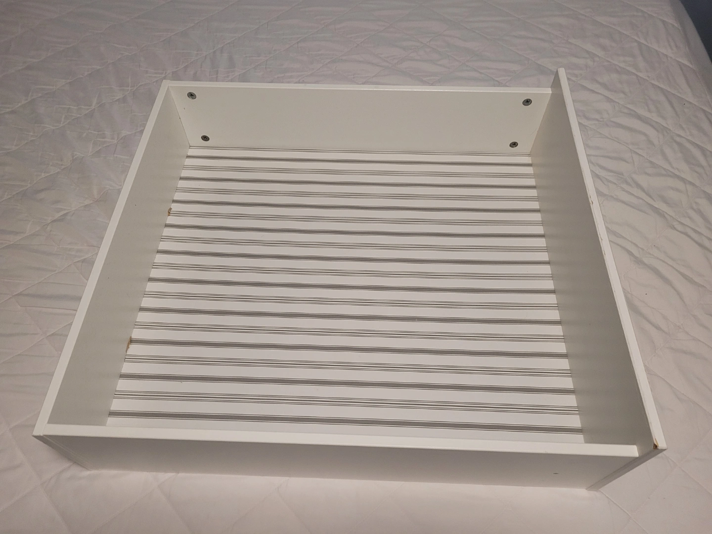 Single white drawer. Good condition. Measures approximately 24 inches long. Ideal for storage or organization. Some minor wear.