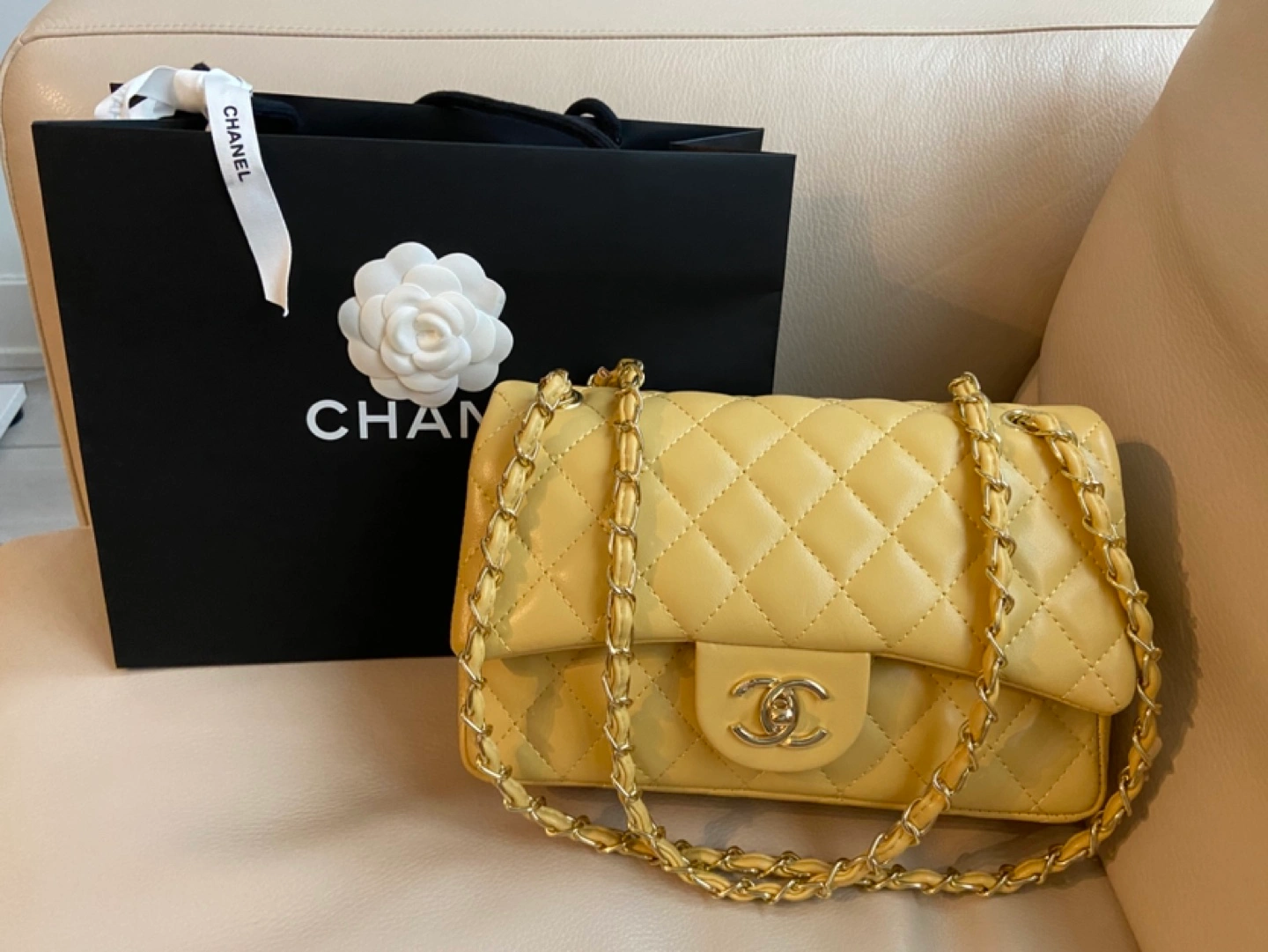 290Gorgeous pale yellow leather Flap bag. Gold-tone hardware. No dust bag No paper bag Please see photos for condition. Never used. just kept in the closet