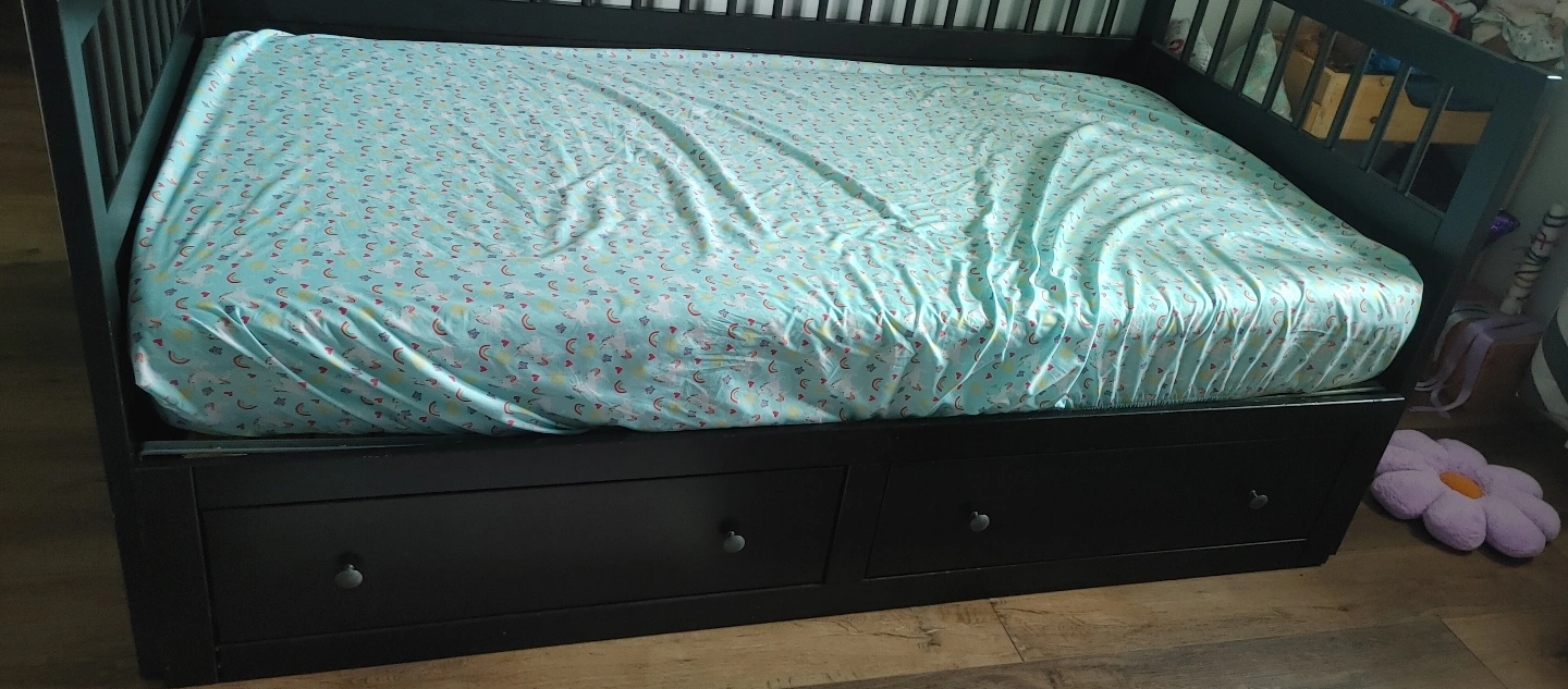 Brown daybed frame with slatted base. Trundle with drawers. Includes two mattresses if wanted. This is will be dissambled prior to arrival.