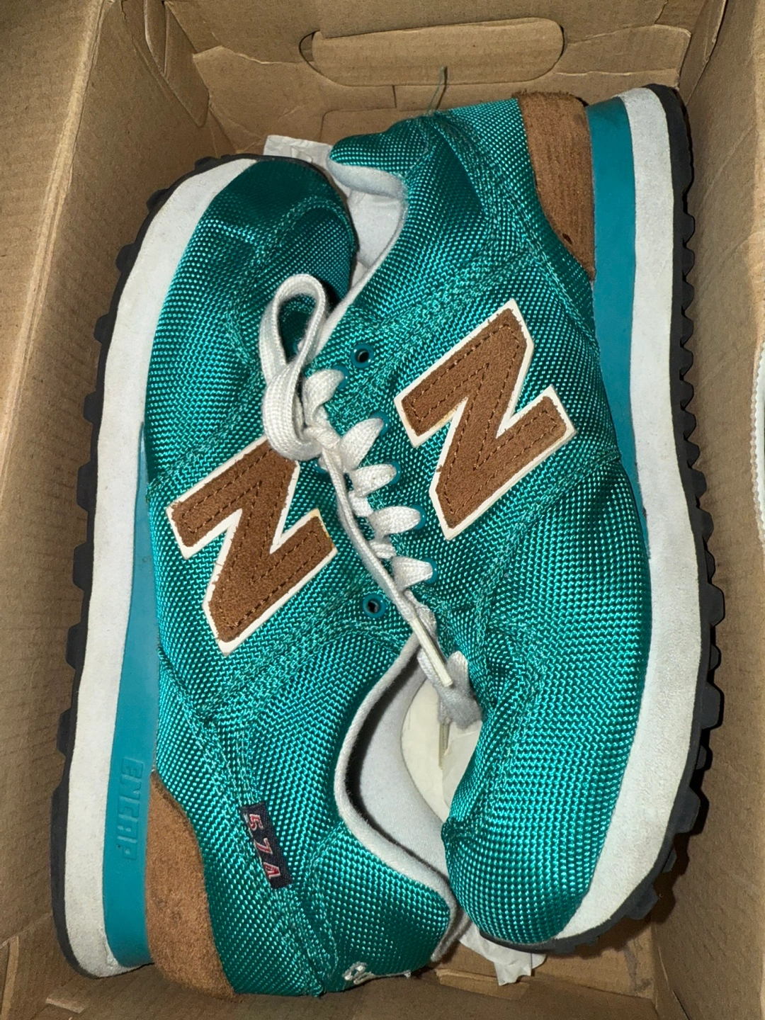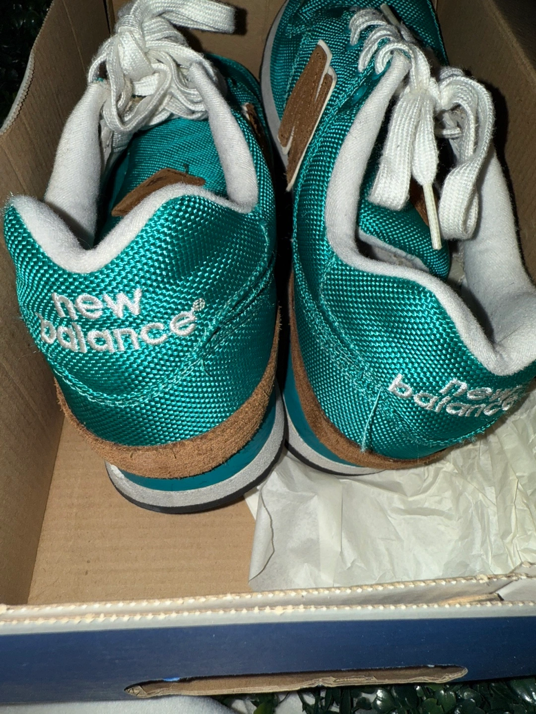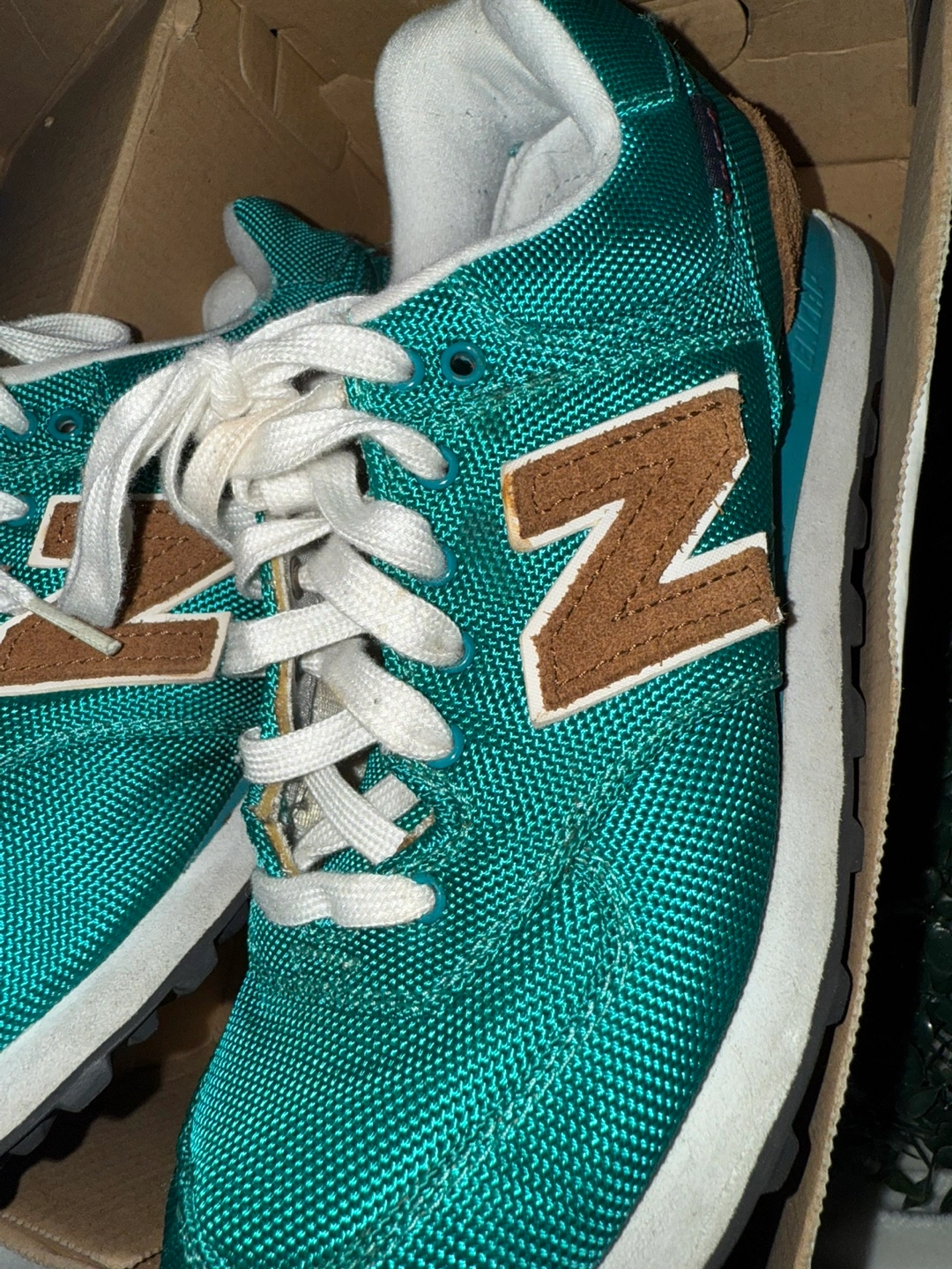 Women's New Balance 574 sneakers. Teal green color. Brown suede accents. White laces. Good condition with some staining and one insole is missing . Sold as is.
