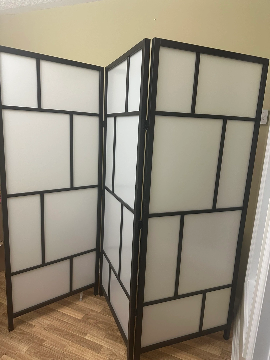 Three panels with Modern design. Very Good condition. Barely use you will save almost $100 dollars on one piece. I have 2 of these.