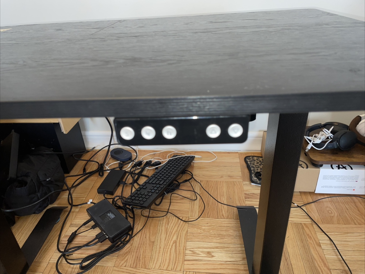 Electric standing desk. Like new. Black desktop. Great condition. Includes power outlets. Height adjustable.