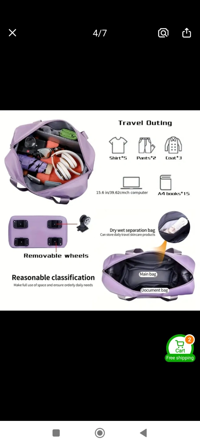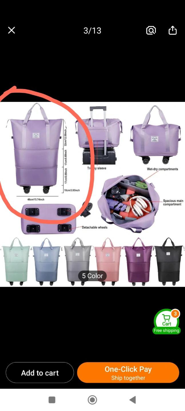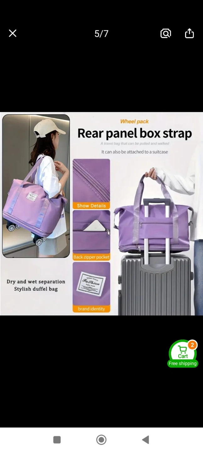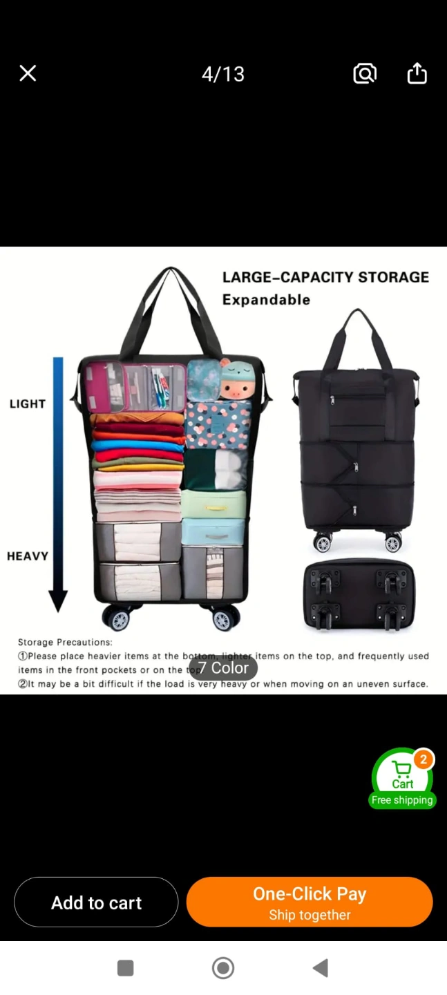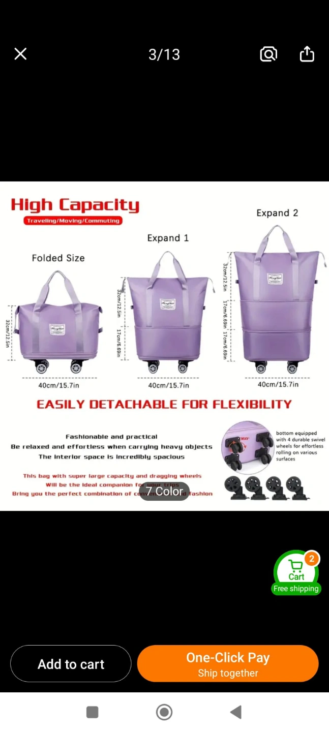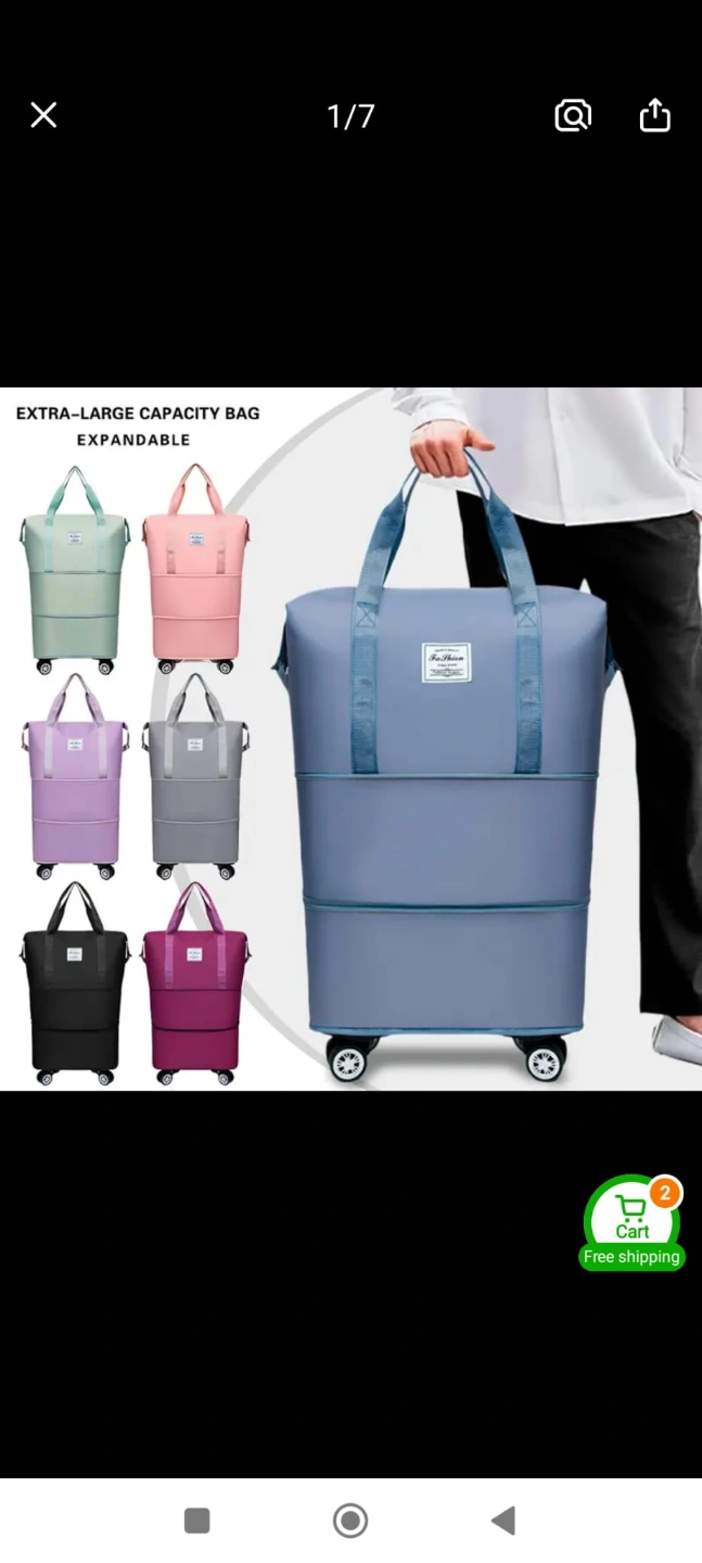 Versatile 3-layer Oxford cloth travel bag. Expandable, foldable with omni-directional wheels. Zippered, Features fixed shoulder straps. Great for travel and vacations.