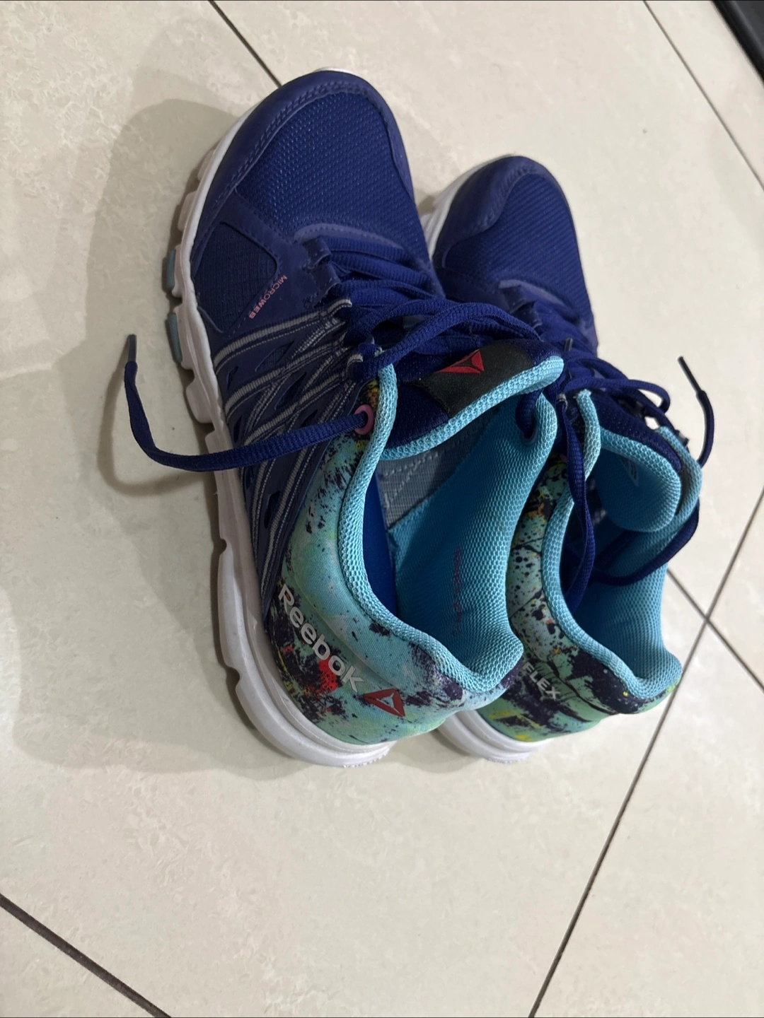 Pre-owned Reebok running shoes. Navy blue with colourful accents. Lace-up closure. Good for everyday wear or light workouts.