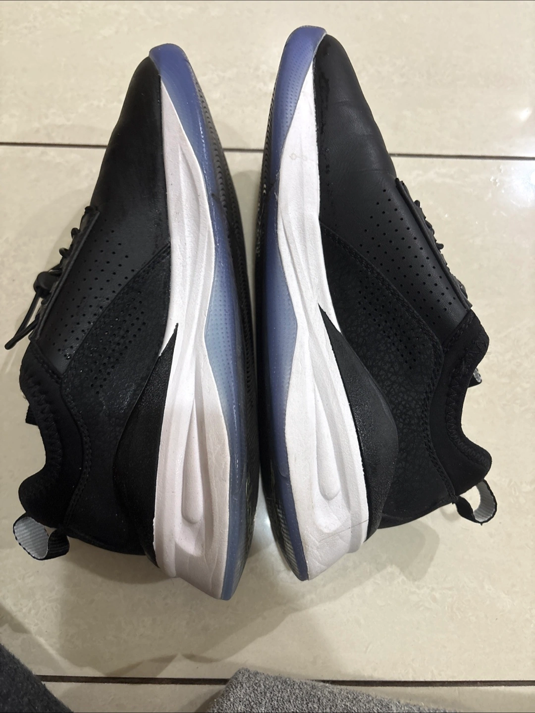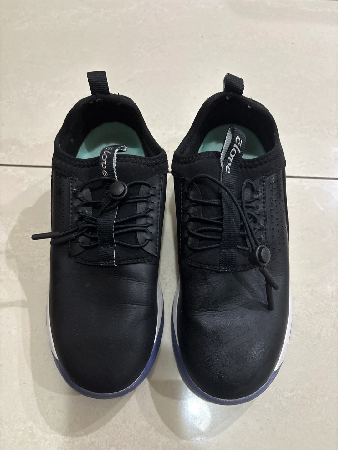Women's slip-on sneakers. Black leather-like upper. White and translucent blue outsole. Elastic laces. Comfortable insole.