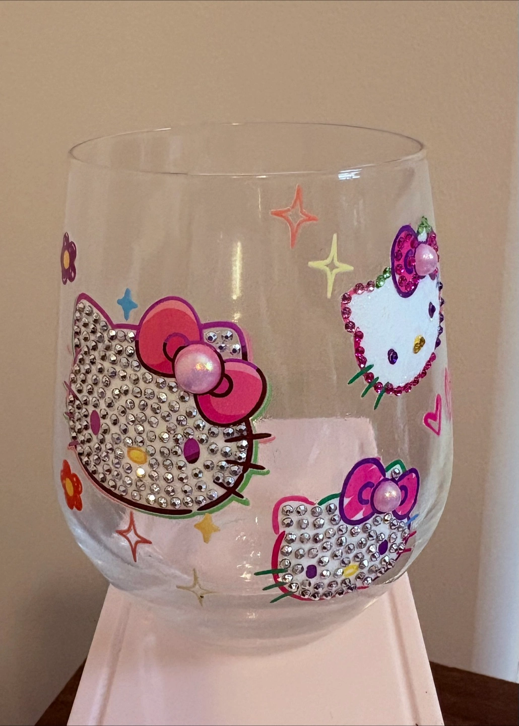 Durable Decorative clear water glass. Features Hello Kitty design with rhinestones. Adorable and sparkly. --Hand Crafted-