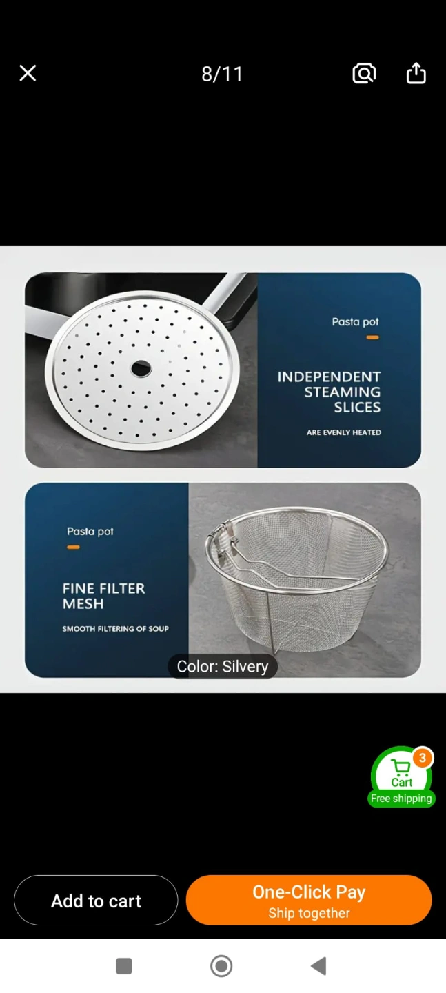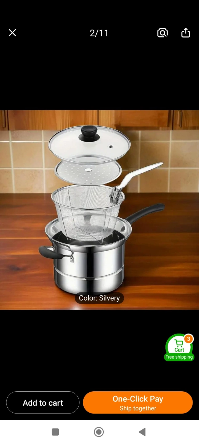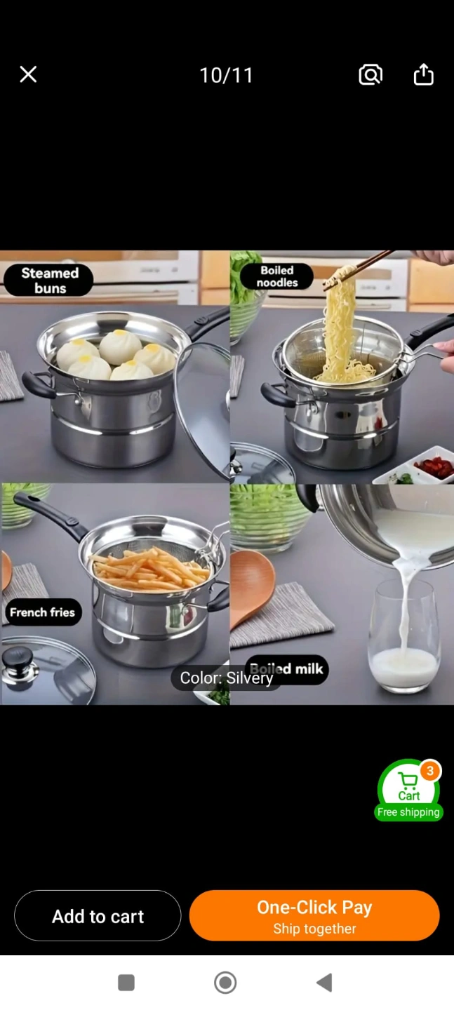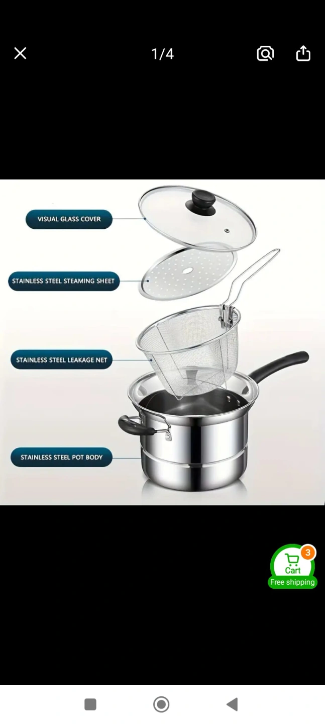 Versatile cooking set. Includes steamer basket, fryer basket, and pot with lid. Suitable for steaming, frying, and boiling. Silver colour. 100% New