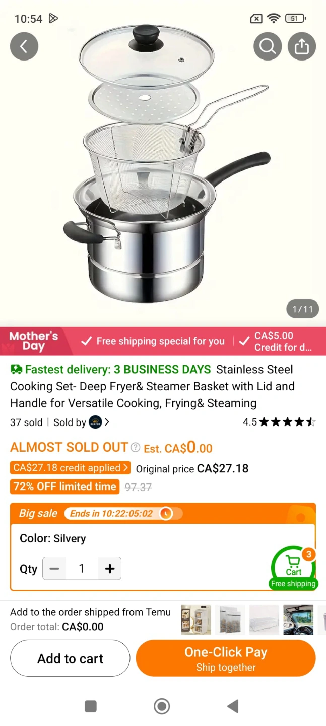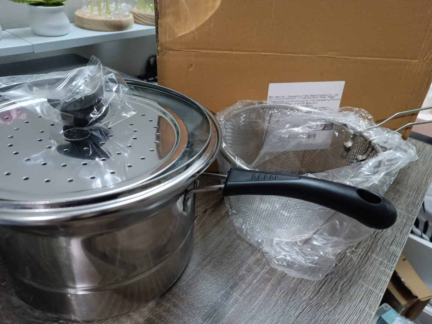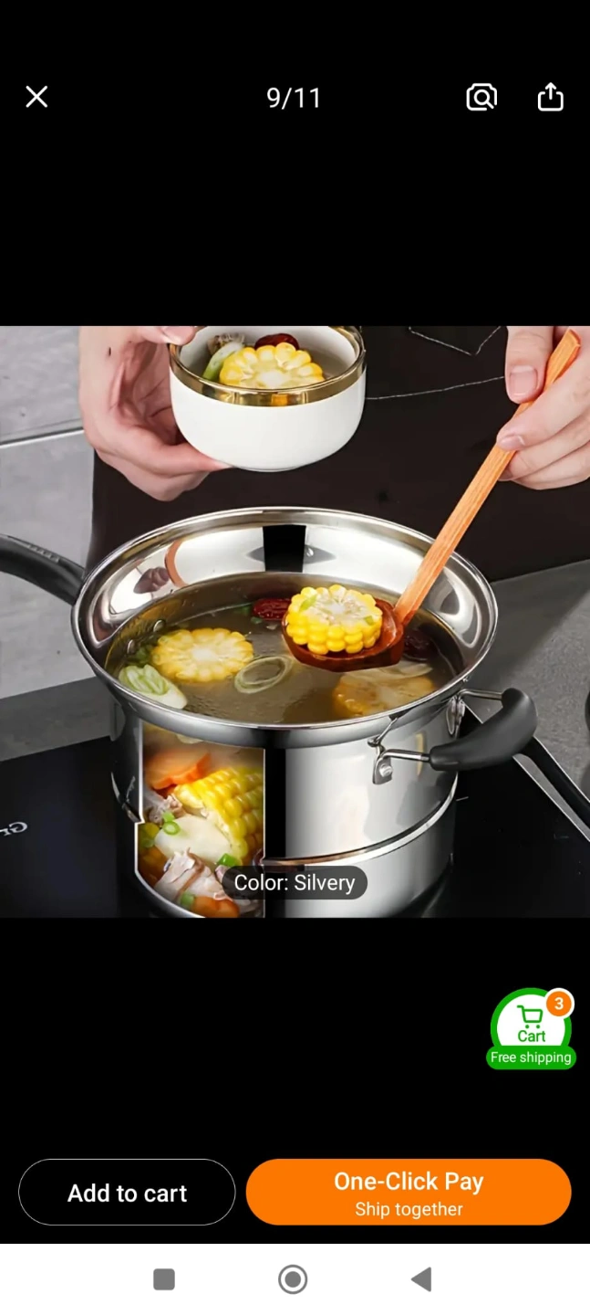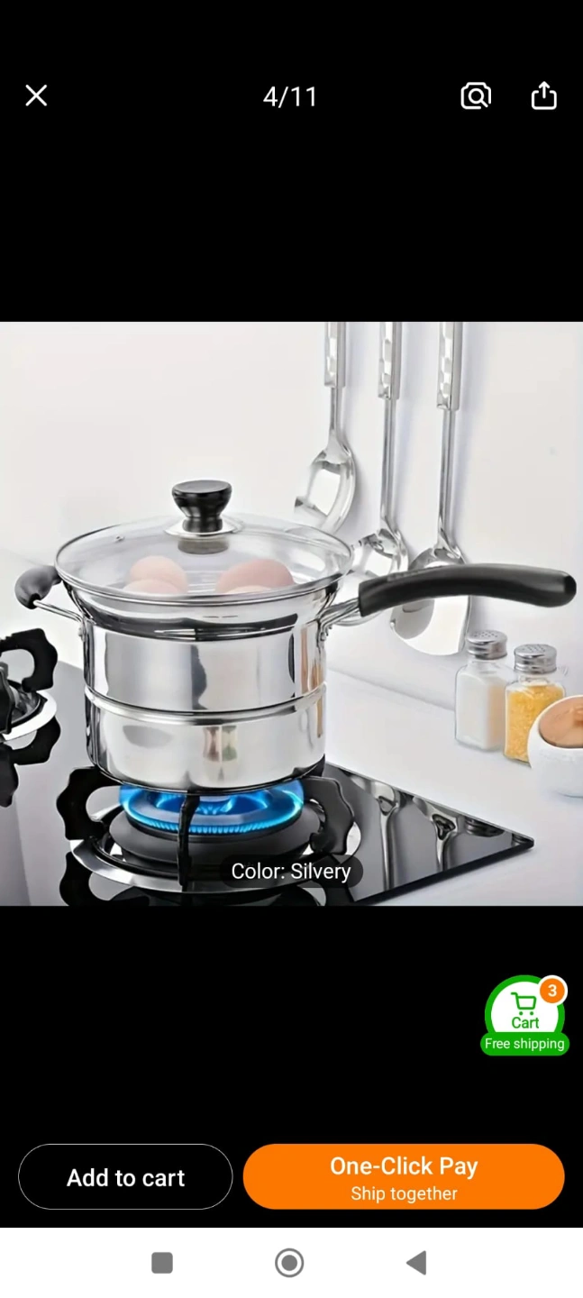 Versatile cooking set. Includes steamer basket, fryer basket, and pot with lid. Suitable for steaming, frying, and boiling. Silver colour. 100% New