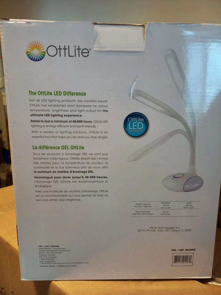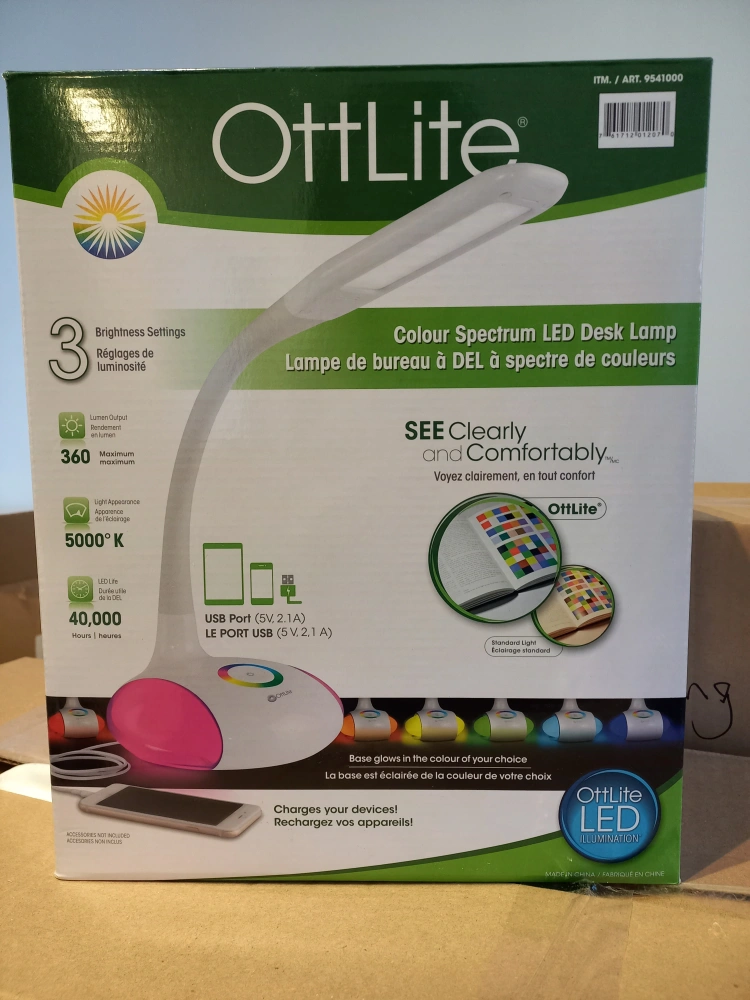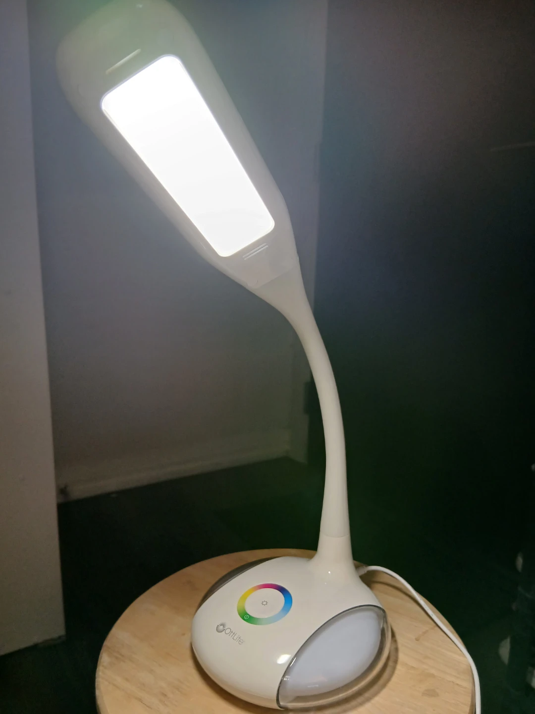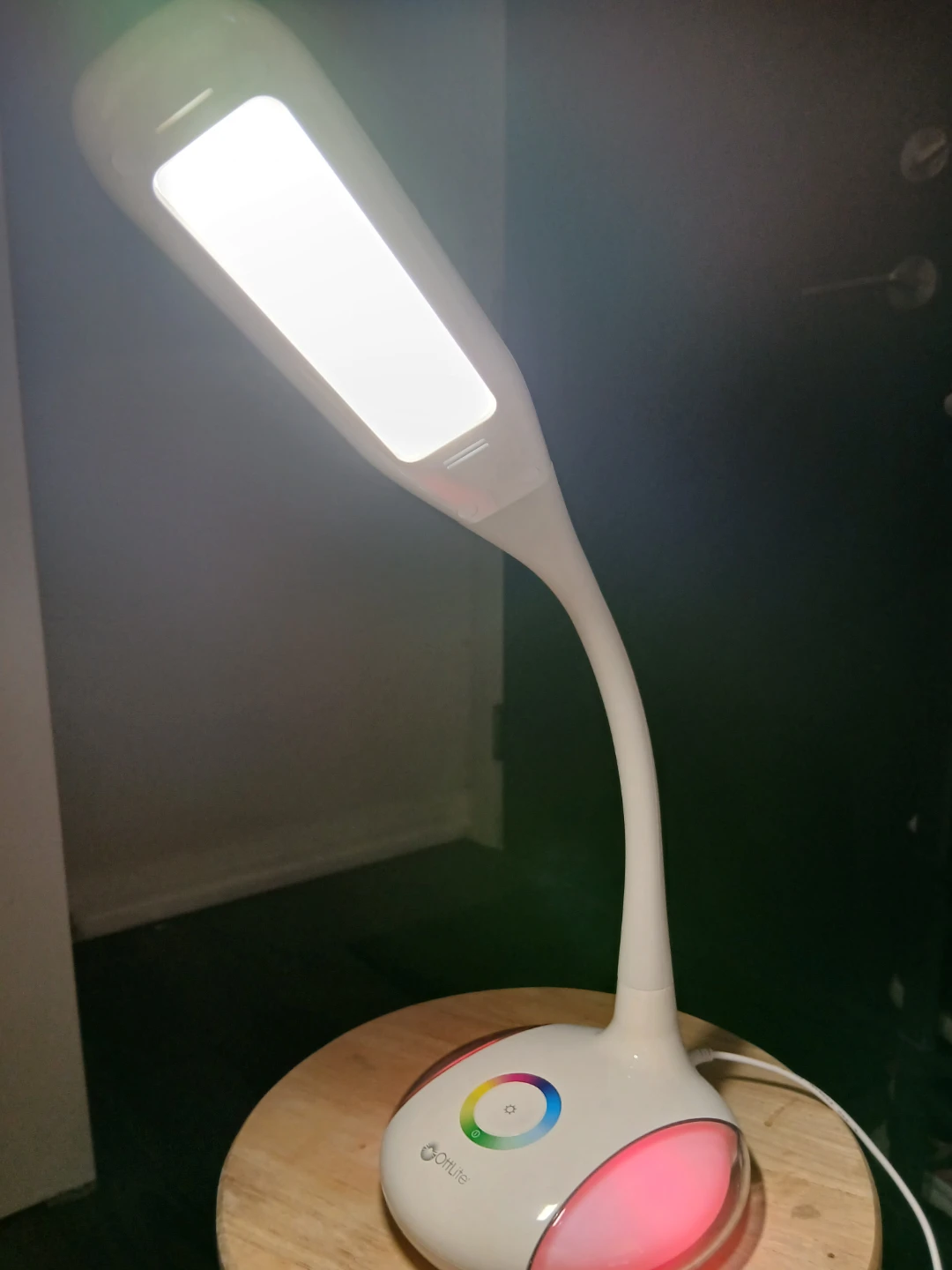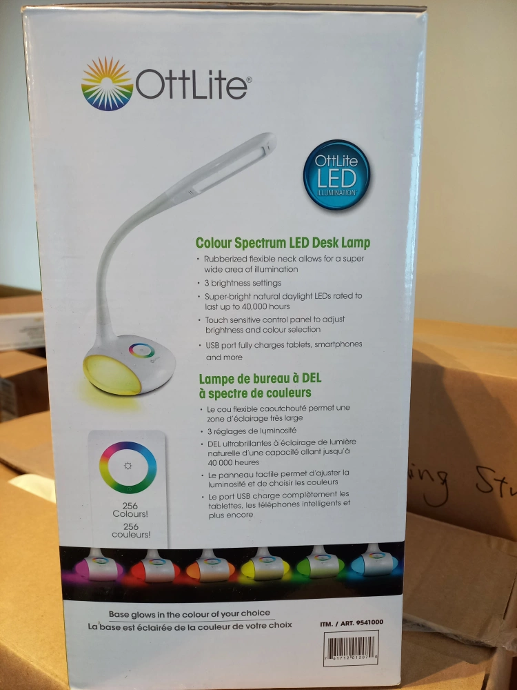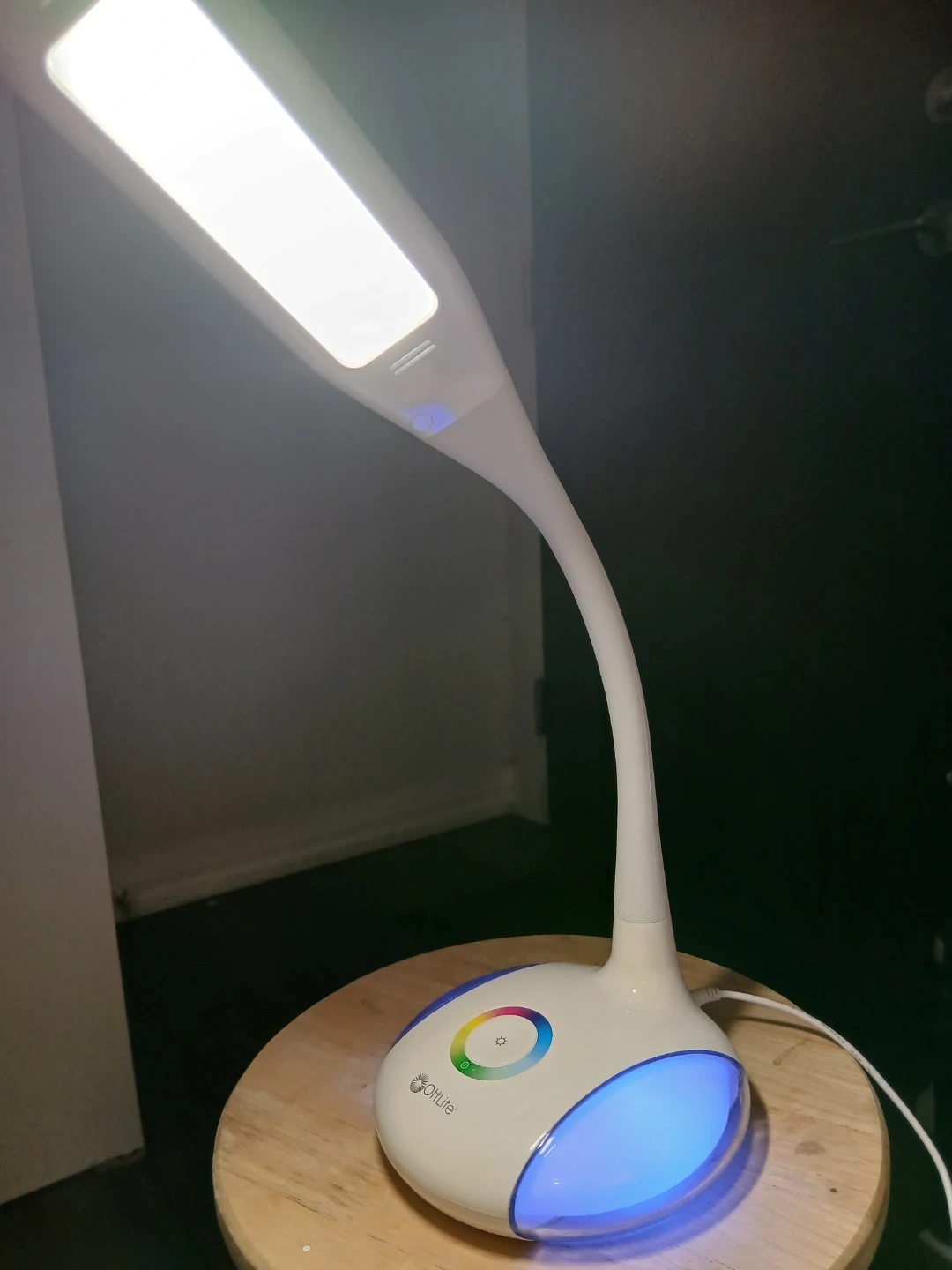 Colour spectrum LED desk lamp. Flexible neck allows for a wide area of illumination. Three brightness settings. Super-bright natural daylight LEDs rated to last up to 40,000 hours. Touch-sensitive control panel. USB port to charge tablets and smartphones. Base glows in the colour of your choice.