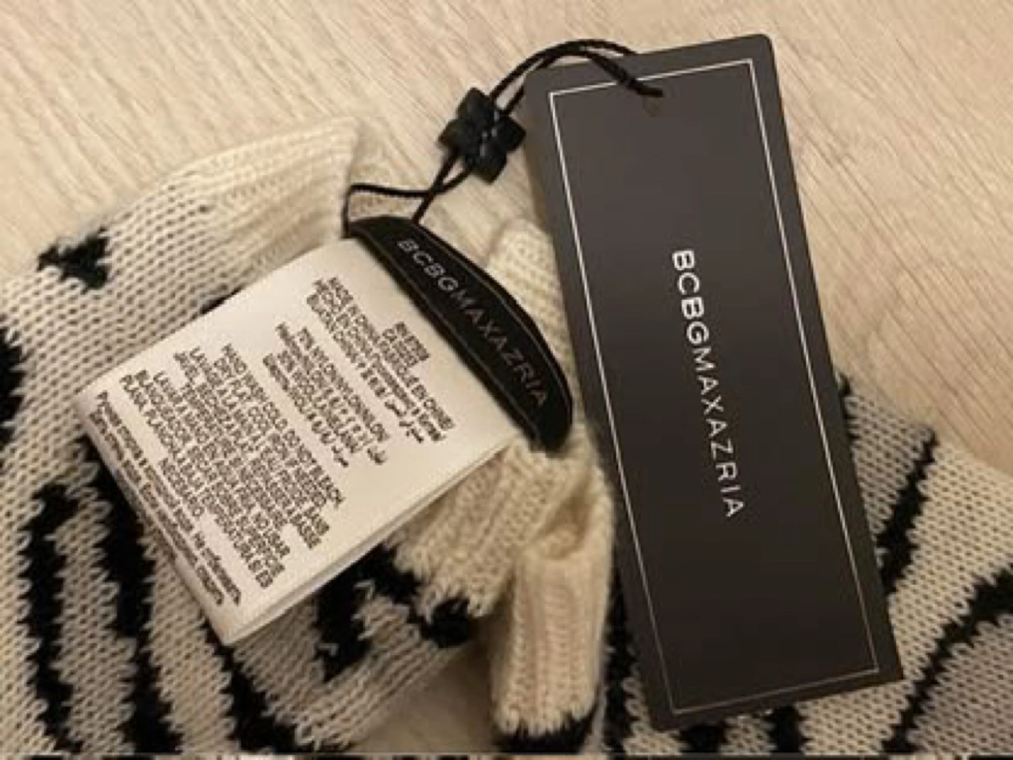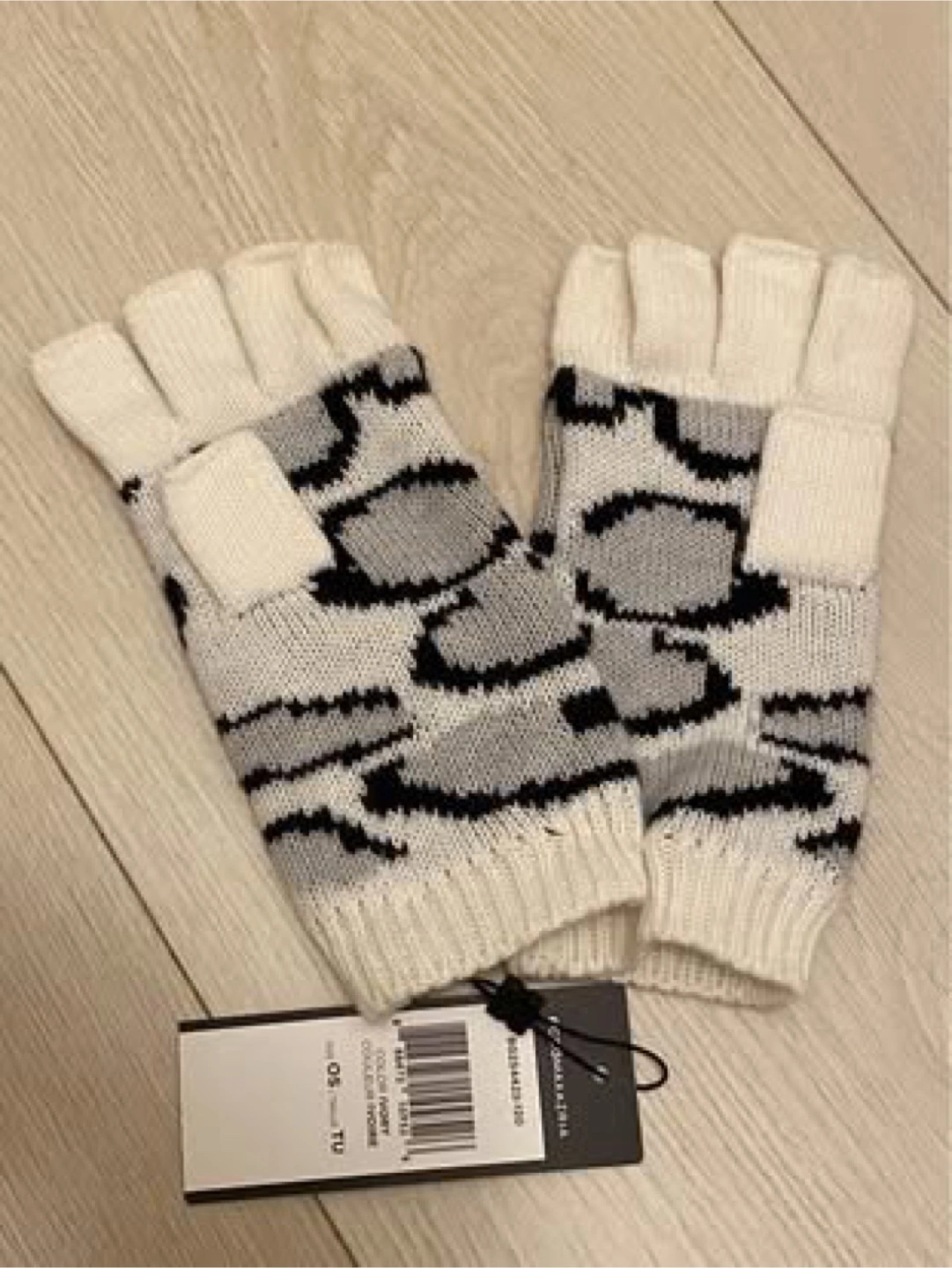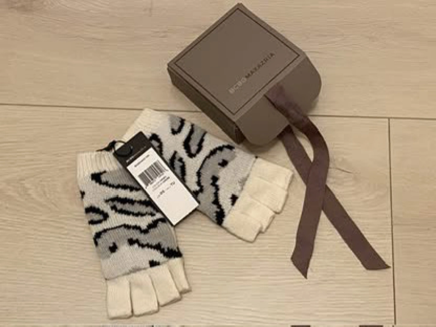 New with tags, fingerless gloves. Cream coloured base with grey and black pattern. Comes in BCBGMAXAZRIA box. One size fits most.