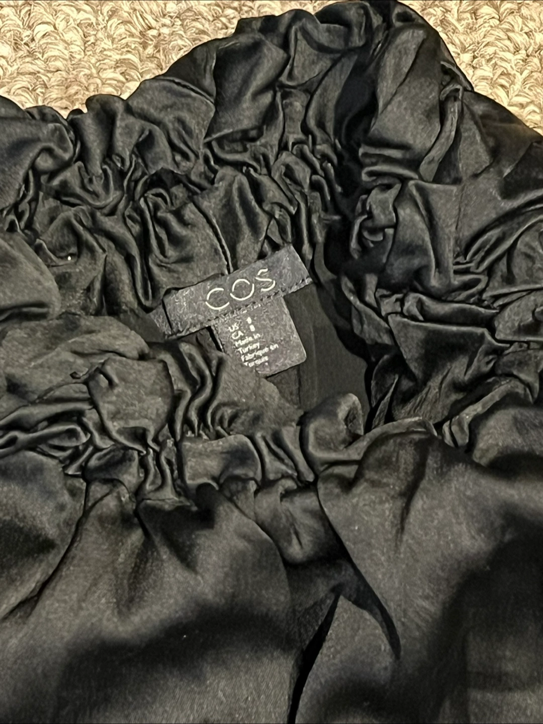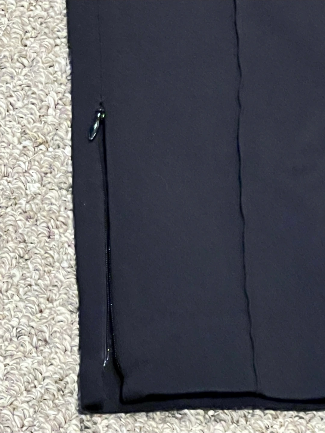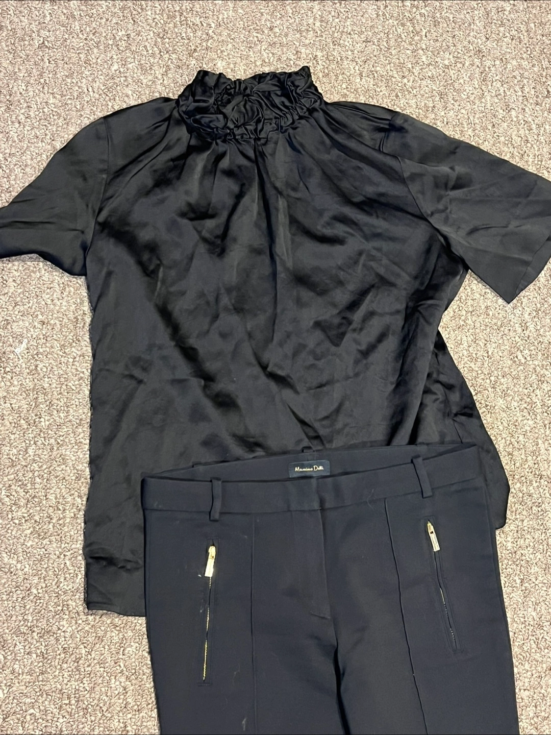 Elegant women's outfit. Includes a black blouse with a ruffled neckline and black pants with gold zipper details. Perfect for work or a night out.